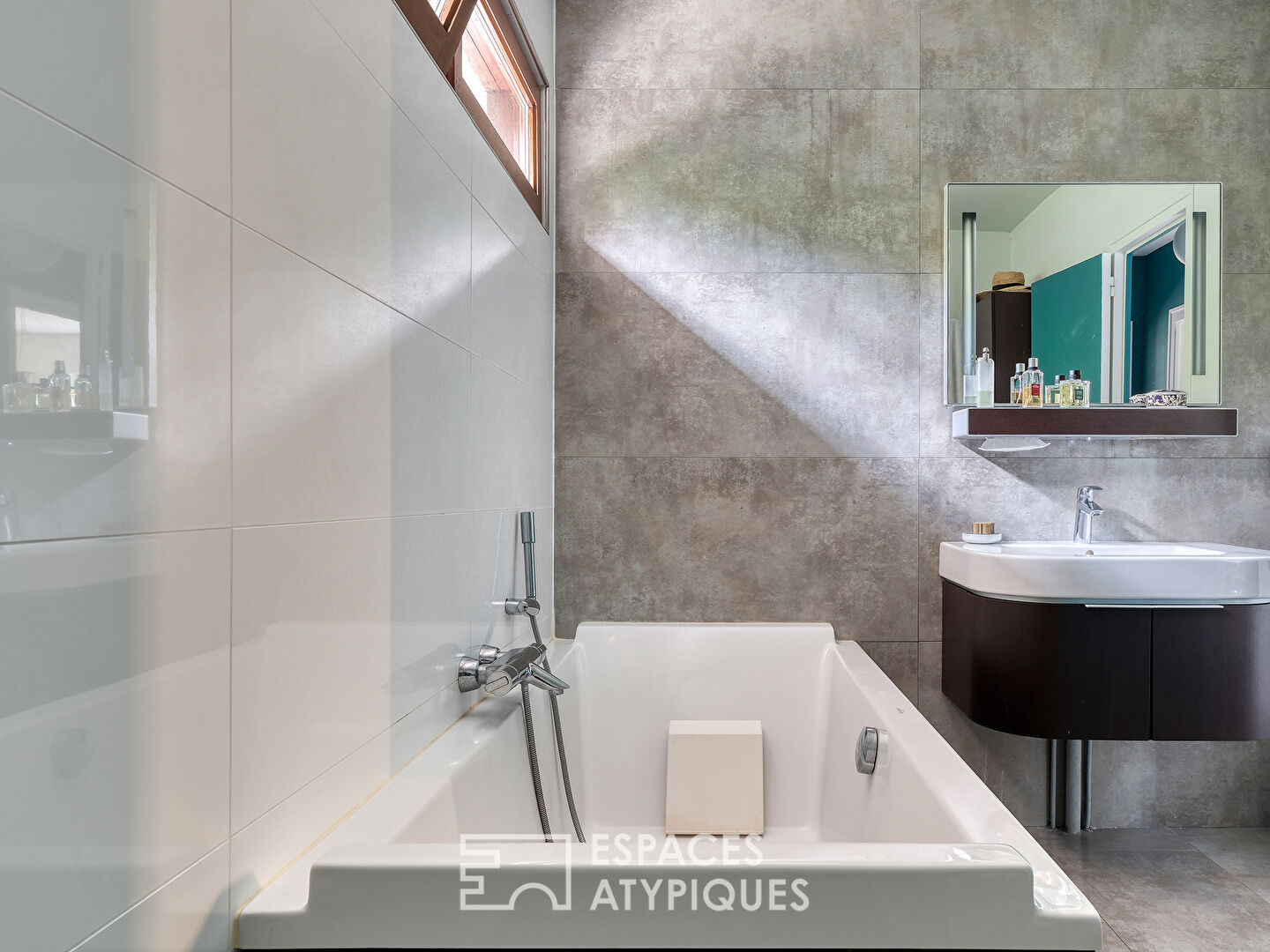 D’inspiration « Midcentury modern », la maison a été bâtie en 1973 dans l’esprit Le Corbusier ou encore Eileen Gray, qui se traduit notamment par sa construction en béton, ses lignes très épurées et ses ouvertures traversantes invitant l’extérieur à l’intérieur.