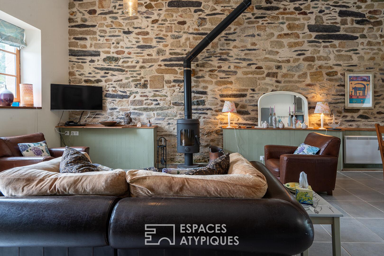Le premier gîte, d’une superficie de 94 m² (83 m² loi Carrez), dévoile une vaste pièce de vie baignée de lumière, équipée d’un poele à bois, sublimée par une cuisine ouverte aux finitions soignées. À l’étage, deux chambres offrent des espaces nuit chaleureux et raffinés, complétés par une salle d’eau avec toilettes.