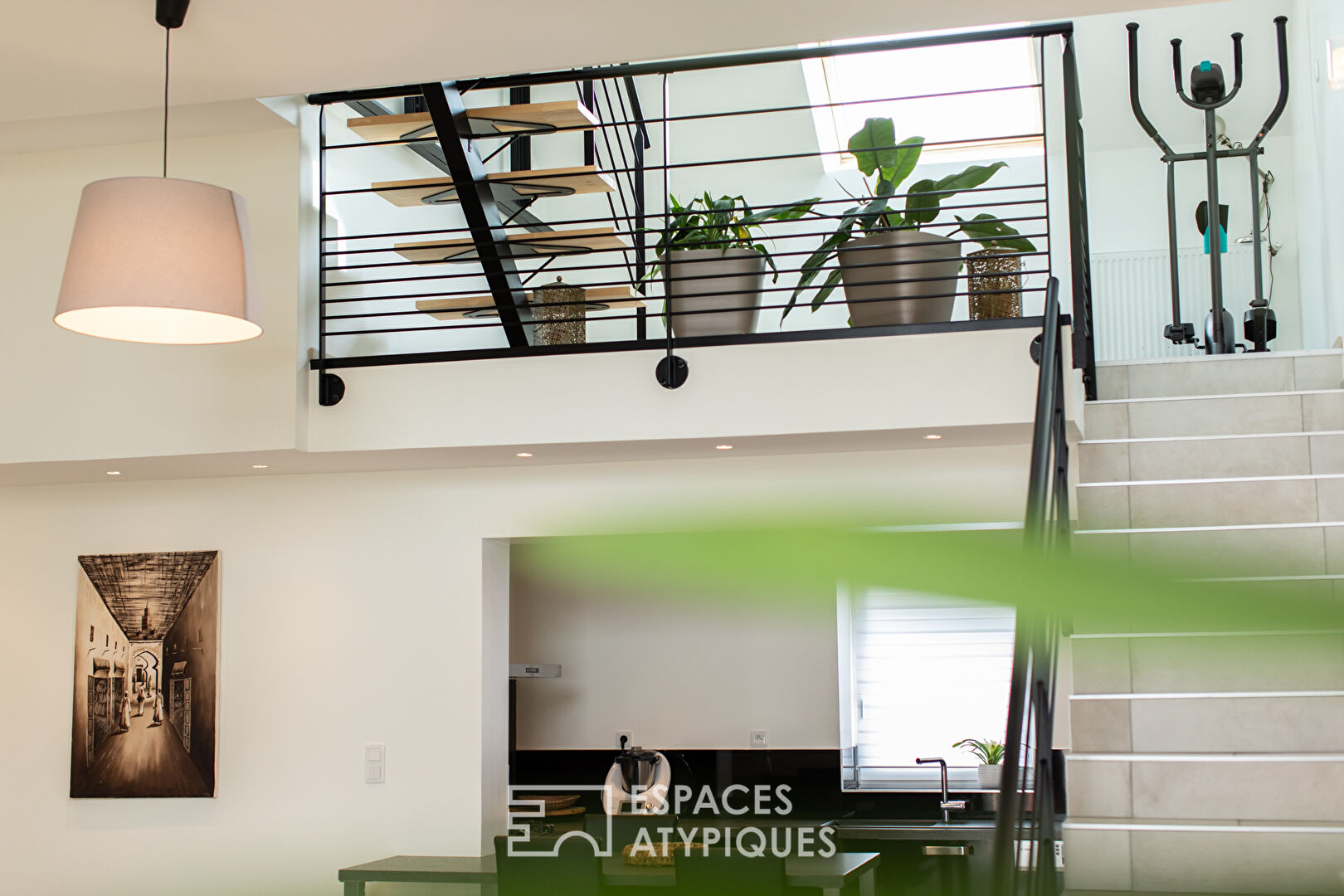 L’entrée directe sur la rue vous permet de tout de suite de vous mettre à l’aise et de découvrir la pièce de vie de 49 m² avec son plafond à 3m50 de haut. La grande porte-fenêtre assure l’apport de lumière, ainsi que l’accès à la terrasse, intimiste, exposée plein Ouest. La cuisine équipée et aménagée est ouverte sur la pièce et garantit des beaux moments conviviaux autour de l’espace repas aménagé en continuité de celle- ci. Le rez-de-chaussée est complété par une salle d’eau avec WC, ainsi que la buanderie qui mène au garage. Le jeu de matières s’exprime lors de l’accès à l’étage qui se fait depuis la pièce de vie. Le béton, le métal et le bois s’y allient. L’étage, mansardé mais de belle hauteur, baigné de lumière et dans lequel la charpente continue de se dévoiler discrètement, assure la découverte d’espaces confortables : la chambre principale avec son spacieux dressing intégré, deux autres chambres pour les enfants ou amis, une salle de bains avec double vasque, douche à l’italienne et baignoire, ainsi d’un WC indépendant.