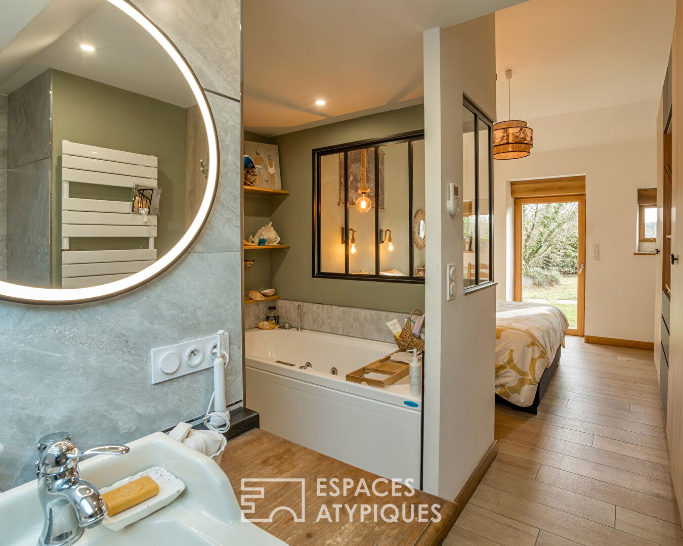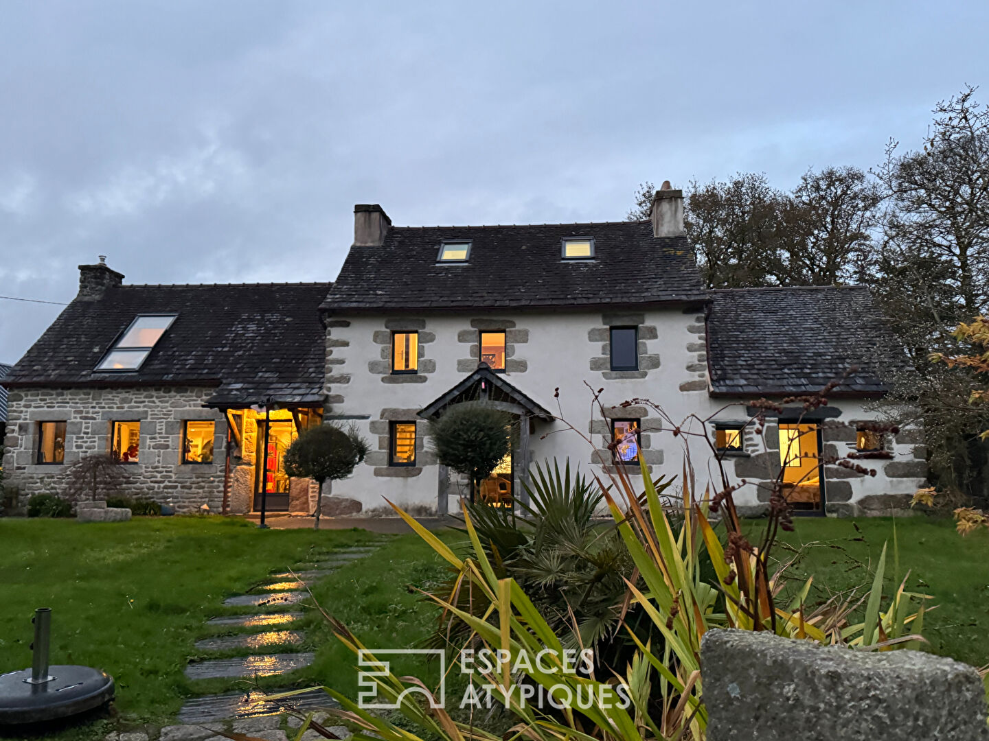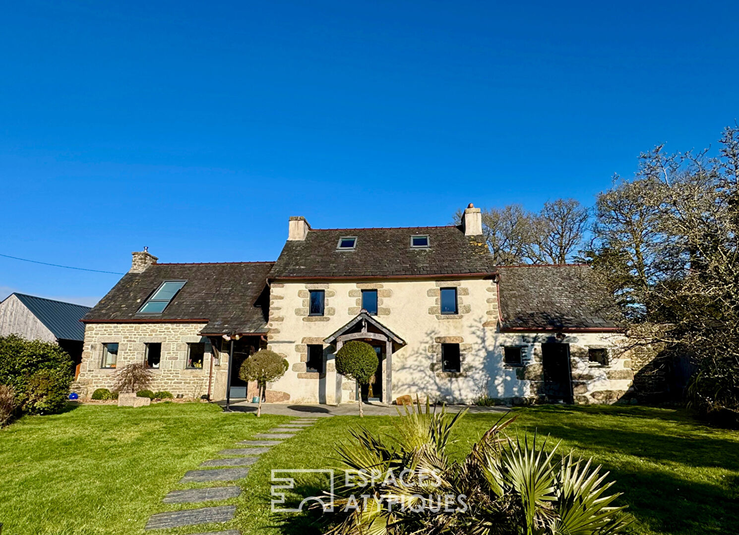 Cet ancien corps de ferme est le fruit d’un pari audacieux : apporter une écriture contemporaine à un lieu empreint d’histoire. Le résultat est un lieu de vie unique et chaleureux. Dès l’arrivée, nous sommes séduits par la rénovation particulièrement réussie grâce au mariage des pierres d’origine, des murs enduits à chaux. La salle à manger, parée de son poêle à granules, est baignée de lumière grâce à son exposition accueille chaleureusement les visiteurs. Prolongée par une terrasse en bois, elle invite à profiter des beaux jours dans un cadre enchanteur. La cuisine semi ouverte à l’esprit campagne chic, alliant modernité et convivialité, La partition se joue en cuisine avec son beau piano de cuisson.Une vaste arrière-cuisine et d’une buanderie aménagées pour un confort optimal complètent cet espace. Le salon, véritable coeur de la maison, offre une ambiance cocooning sublimée par un beau poêle à bois GODIN et un parquet en chêne massif. Les détails soignés de cet espace en font un lieu de détente idéal. La suite parentale raffinée, située en rez-de-chaussée, impressionne par son confort et sa fonctionnalité. Elle dispose d’un dressing sur mesure, d’une salle de bain élégante équipée d’une baignoire balnéo et d’une douche à l’italienne, ainsi que d’une terrasse privative permettant de savourer de douces soirées bretonnes. À l’étage, une chambre spacieuse avec dressing et velux balcon offre une vue imprenable sur la nature environnante.