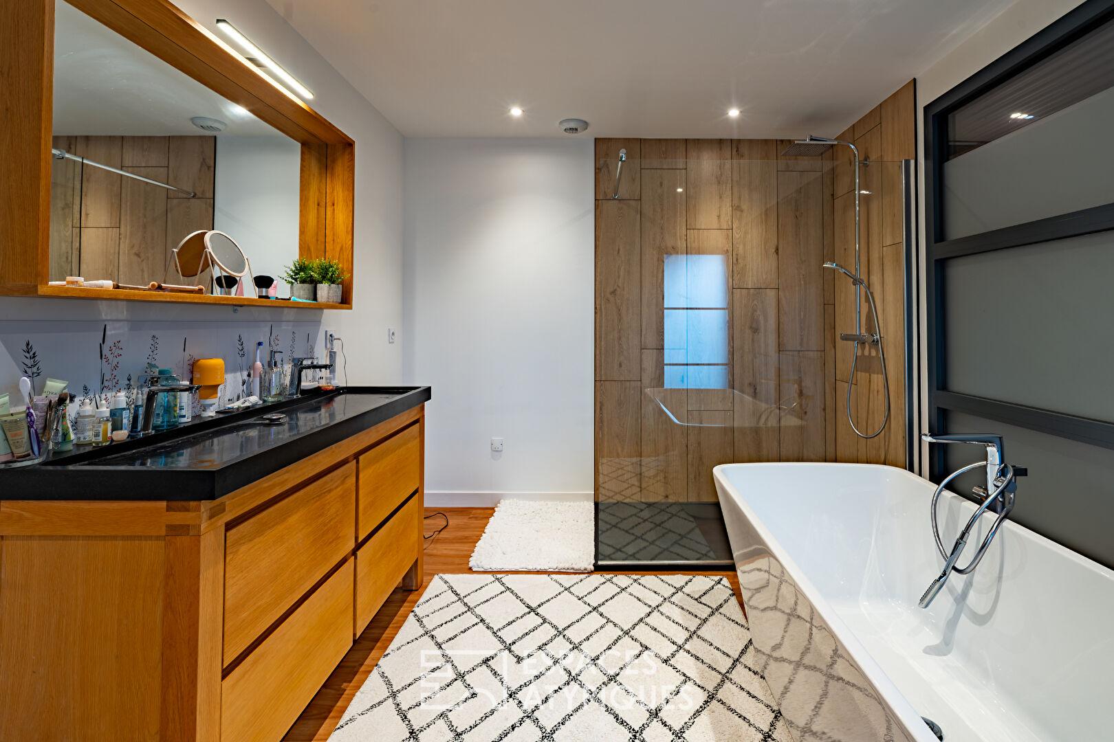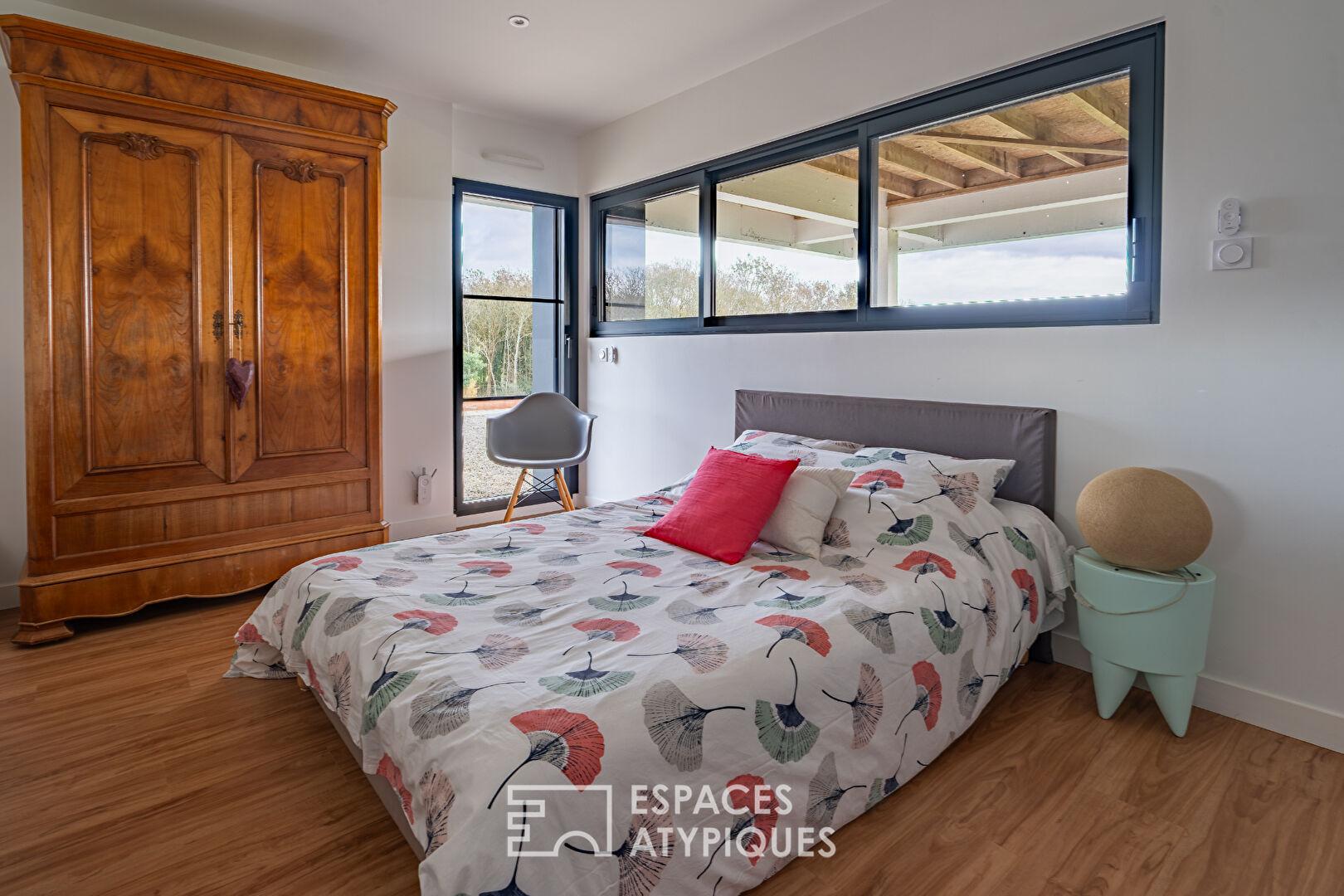 L’étage dessert des espaces nuit pensés pour le confort. La suite parentale s’étend sur une chambre généreuse, un grand dressing aménagé et une salle de bains élégante composée d’une douche à l’italienne et d’une baignoire. Deux autres chambres profitent de volumes agréables, dont l’une prolongée par un toit-terrasse offrant une vue dégagée sur la verdure environnante. Une salle d’eau moderne ainsi qu’un WC indépendant complètent ce niveau.