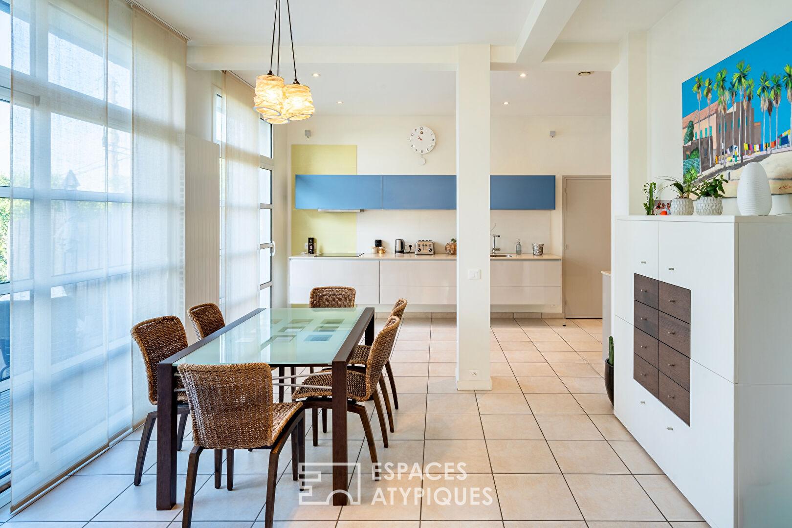 Dans le prolongement, la vaste cuisine aménagée et équipée, de belle facture, s’inscrit naturellement dans la continuité des espaces de vie. Fonctionnelle et élégante, elle profite d’une belle hauteur sous plafond de 2,80 m, de larges baies vitrées et d’un accès direct à la terrasse extérieure, offrant une relation dedans-dehors fluide.