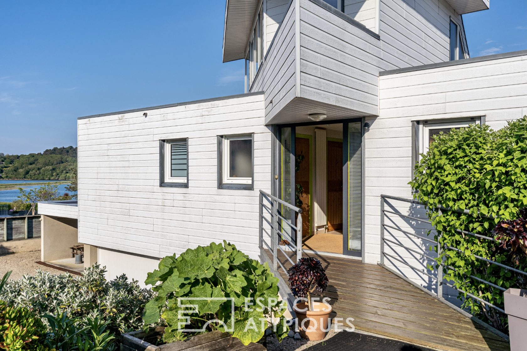 La réalisation architecturale, de 1997, aux formes singulières, a été réalisée dans l’idée d’exploiter naturellement son environnement très privilégié. La contemporaine se distingue au premier regard par son étonnante façade, pensée et conçue tel un bateau face à la grande bleue. Littéralement posée au bord de l’eau, son architecture homogène épousant le sol veut se confondre dans la nature environnante verdoyante en harmonie avec la mer. Aménagée avec des matériaux de belles factures, elle s’intègre à merveille dans son environnement. Cette maison dévoile toute sa personnalité au travers de 155 m2 de surface sur un jardin entièrement clos et paysagé de 1405 m2.
