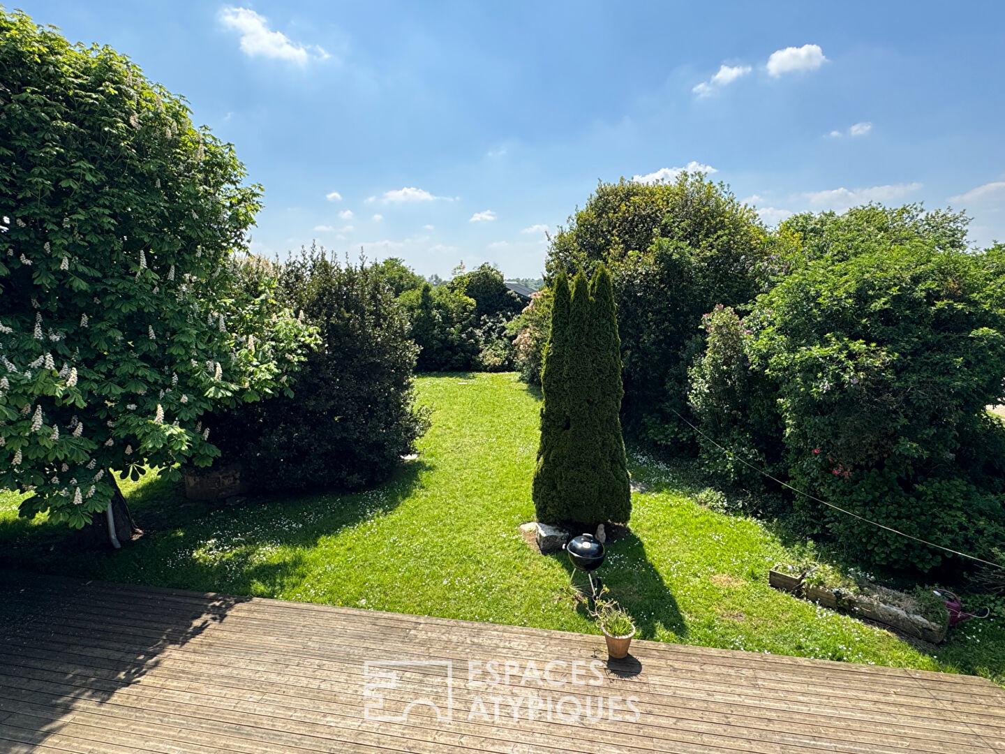 À l’extérieur, le jardin clos et arboré compose un écrin de verdure intime. La vaste terrasse en bois de plus de 110 m², exposée plein Sud, devient un véritable prolongement des pièces de vie, pensé pour recevoir et profiter pleinement des saisons.En fond de parcelle, un vaste appentis, discret et pratique, abrite les essentiels du jardin et les retours de plage.