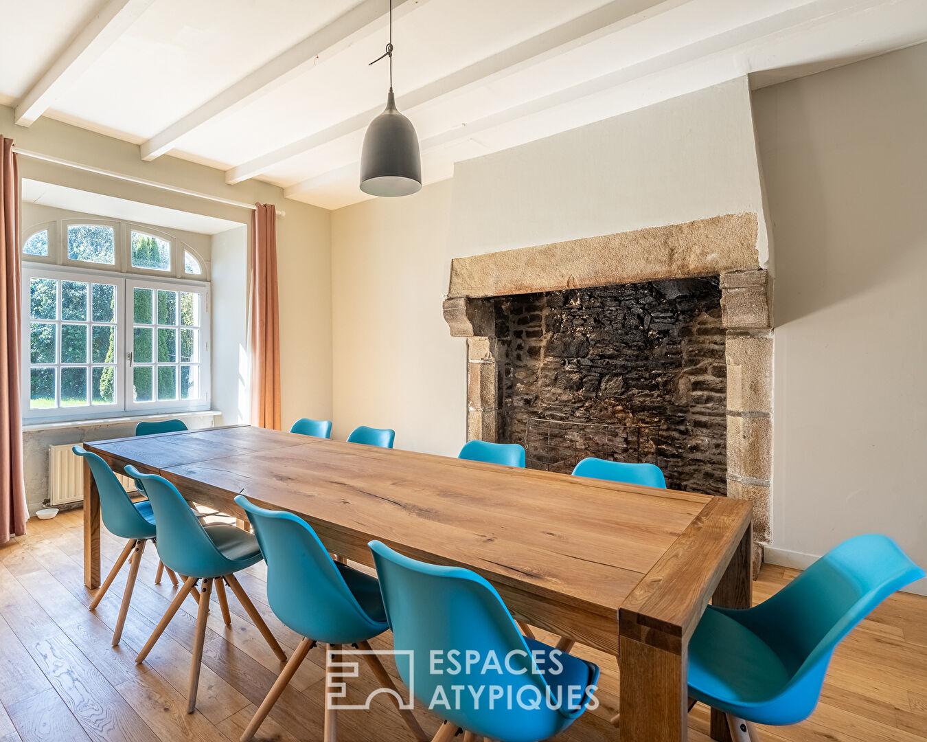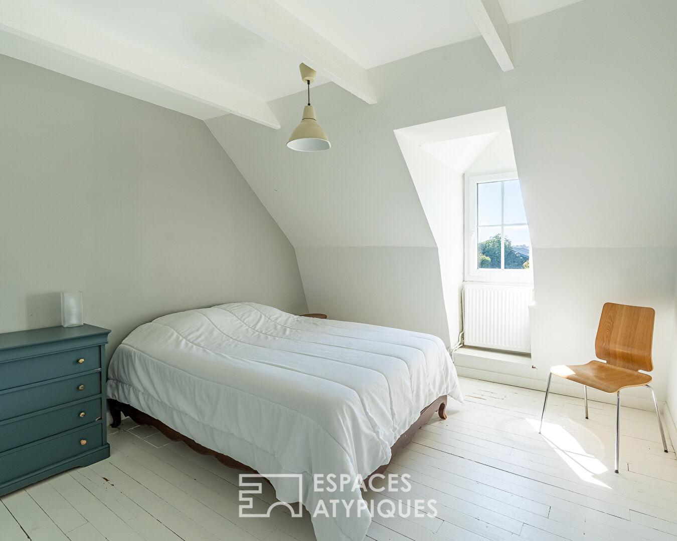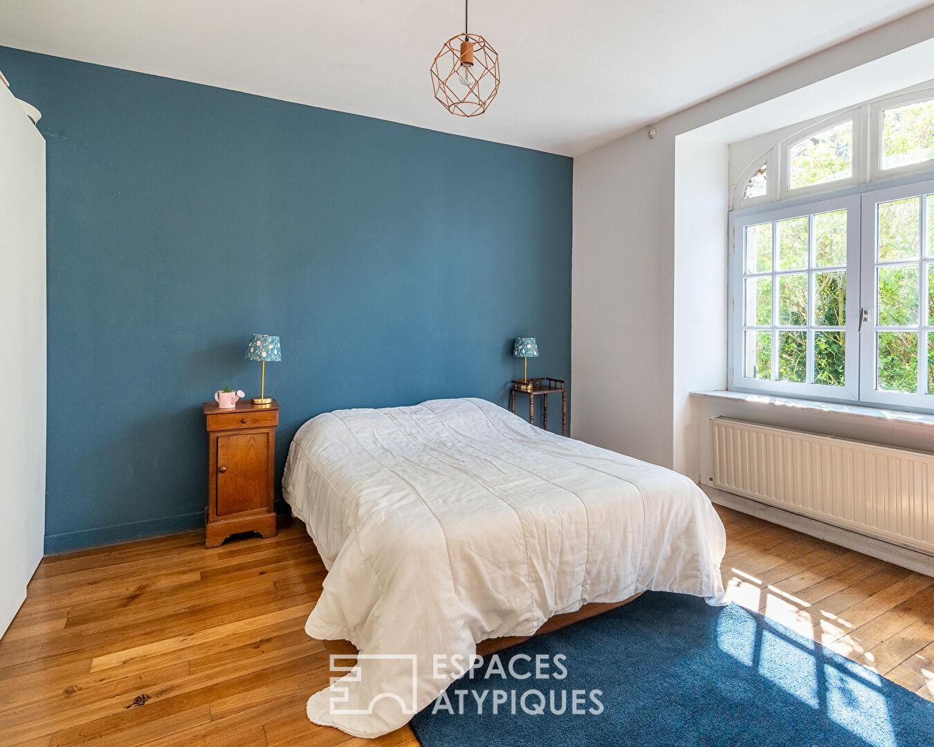 Le salon, baigné de lumière grâce à sa large baie orientée plein sud, révèle tout le cachet de la bâtisse avec ses poutres apparentes et ses volumes aérés.La vaste salle à manger affirme une atmosphère plus intime. Sa cheminée en pierre, son parquet ancien et sa hauteur sous plafond en font un lieu de réception chaleureux, propice aux moments partagés En retrait, la chambre parentale déploie ses teintes profondes dans une ambiance douce et épurée. Rangements intégrés, vue sur le jardin et salle d’eau privative en faïence poudrée composent un cocon raffiné et fonctionnel, pensé pour le confort quotidien.