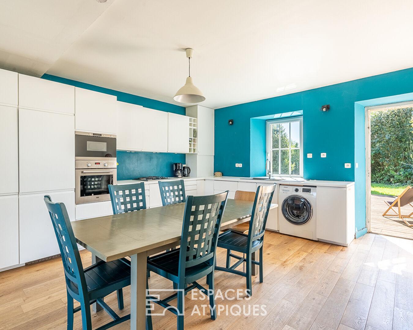 La cuisine, conviviale et ouverte sur l’extérieur, prolonge les usages vers la terrasse et le jardin, créant une continuité agréable aux beaux jours.