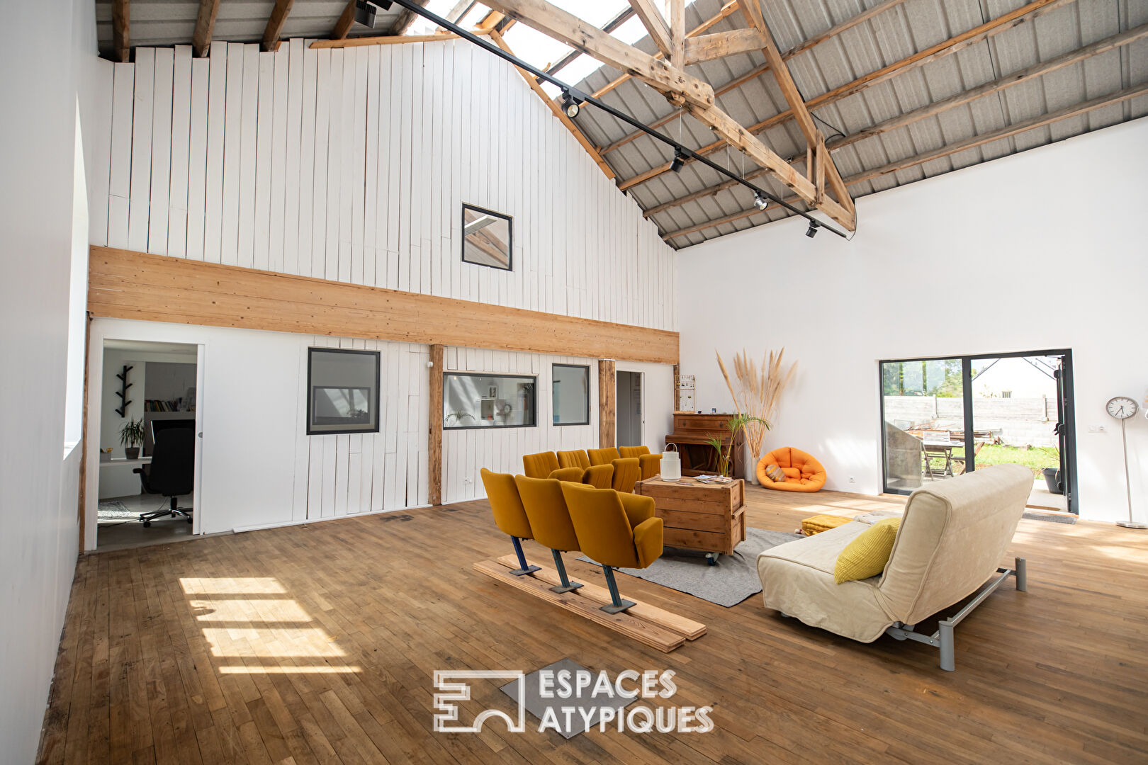 Le premier volume, d’une hauteur vertigineuse, développe près de 70 m² baignés de lumière, dans une atmosphère poétique, onirique et résolument inspirante. Cet espace central dialogue avec un open-space de bureaux ainsi qu’une cuisine aménagée et équipée, formant un ensemble fluide et convivial.