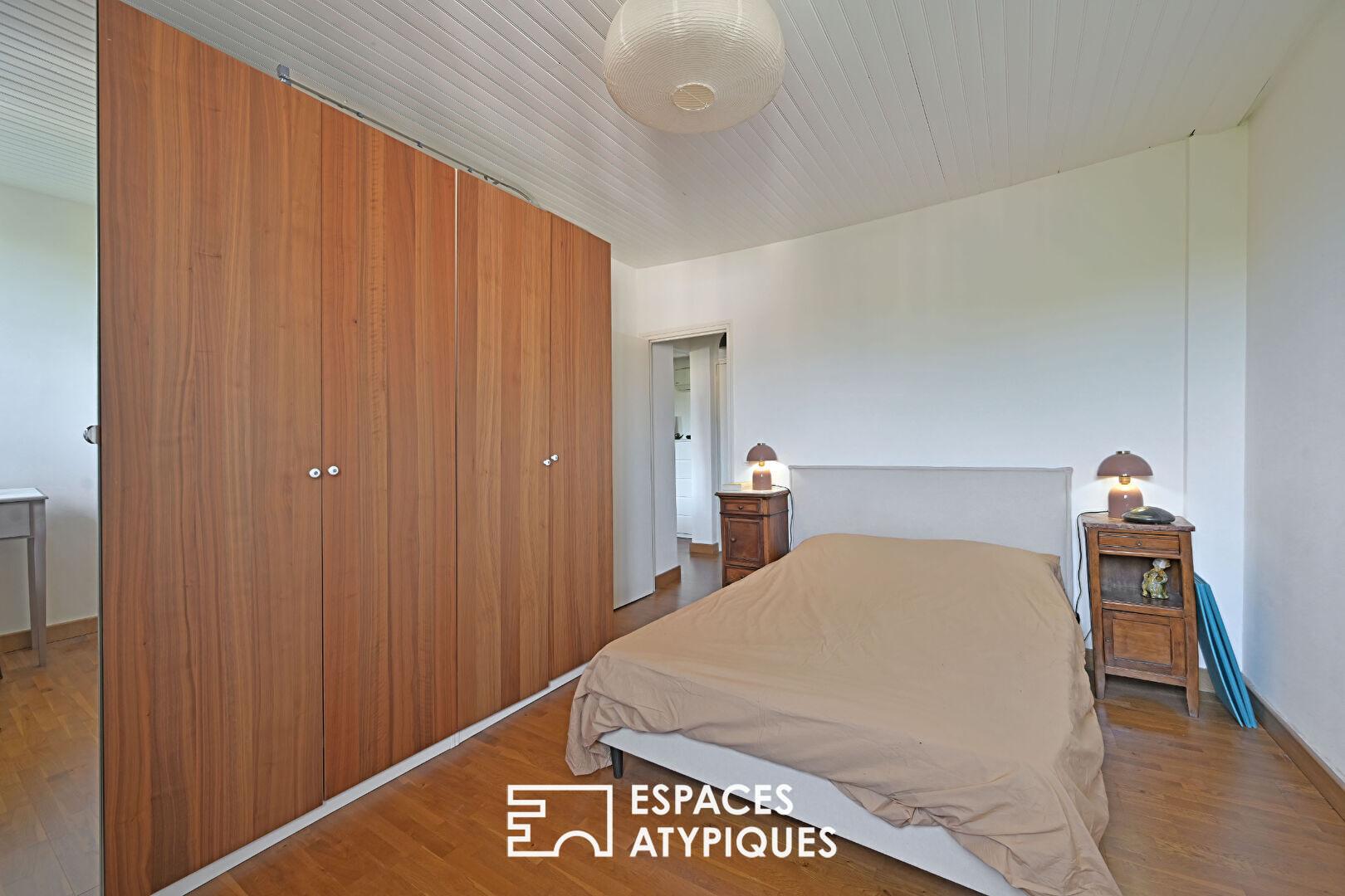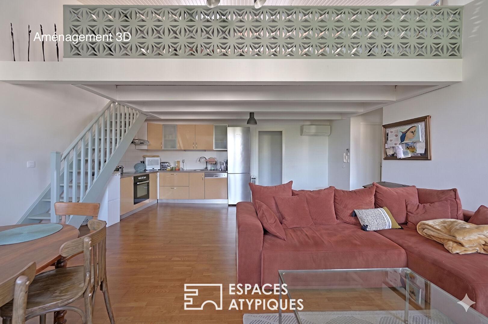 À l’étage, une mezzanine de 25 m2 (14 m2 carrez) surplombe le salon, offrant un espace idéal pour un bureau inspirant ou une seconde chambre.