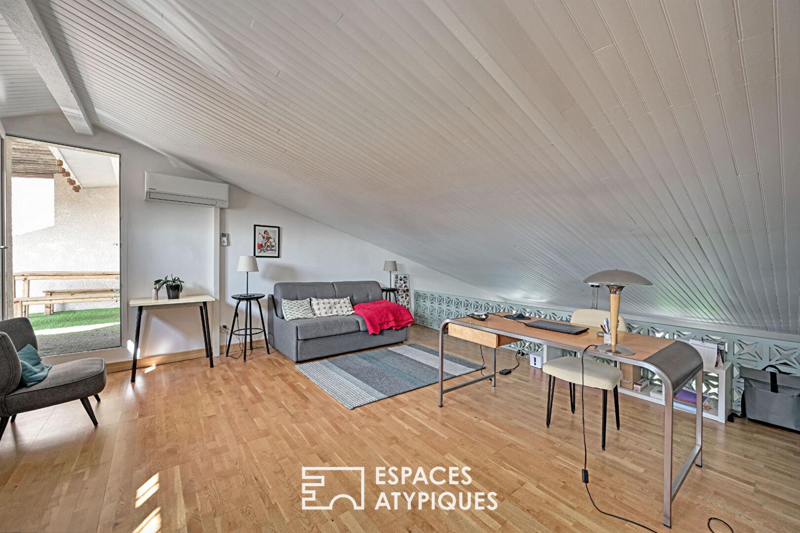 Dans son prolongement, une terrasse couverte intimiste dévoile un panorama imprenable sur les toits de la ville. Une invitation à la détente en coeur de ville.