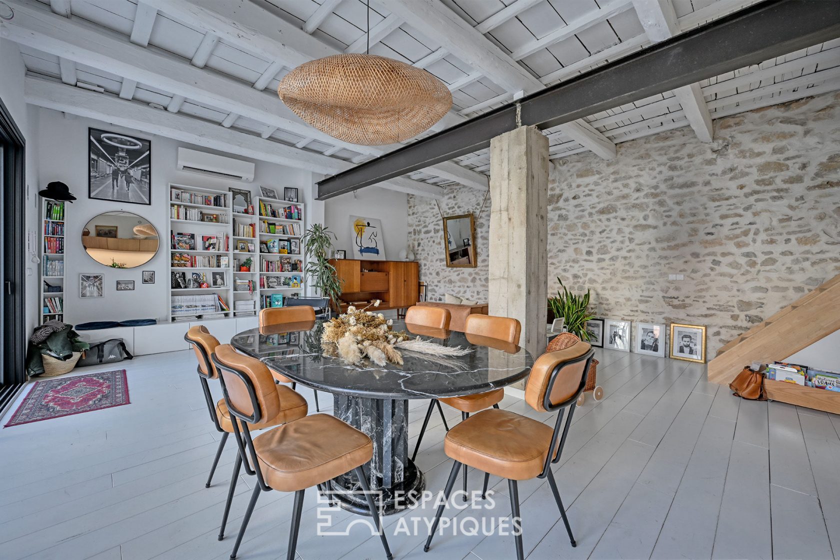 Agencée sur 2 niveaux, la maison possède en rez-de-chaussée un bel espace de vie de 50m2 qui s’ouvre sur l’extérieur, avec une cuisine équipée ouverte.