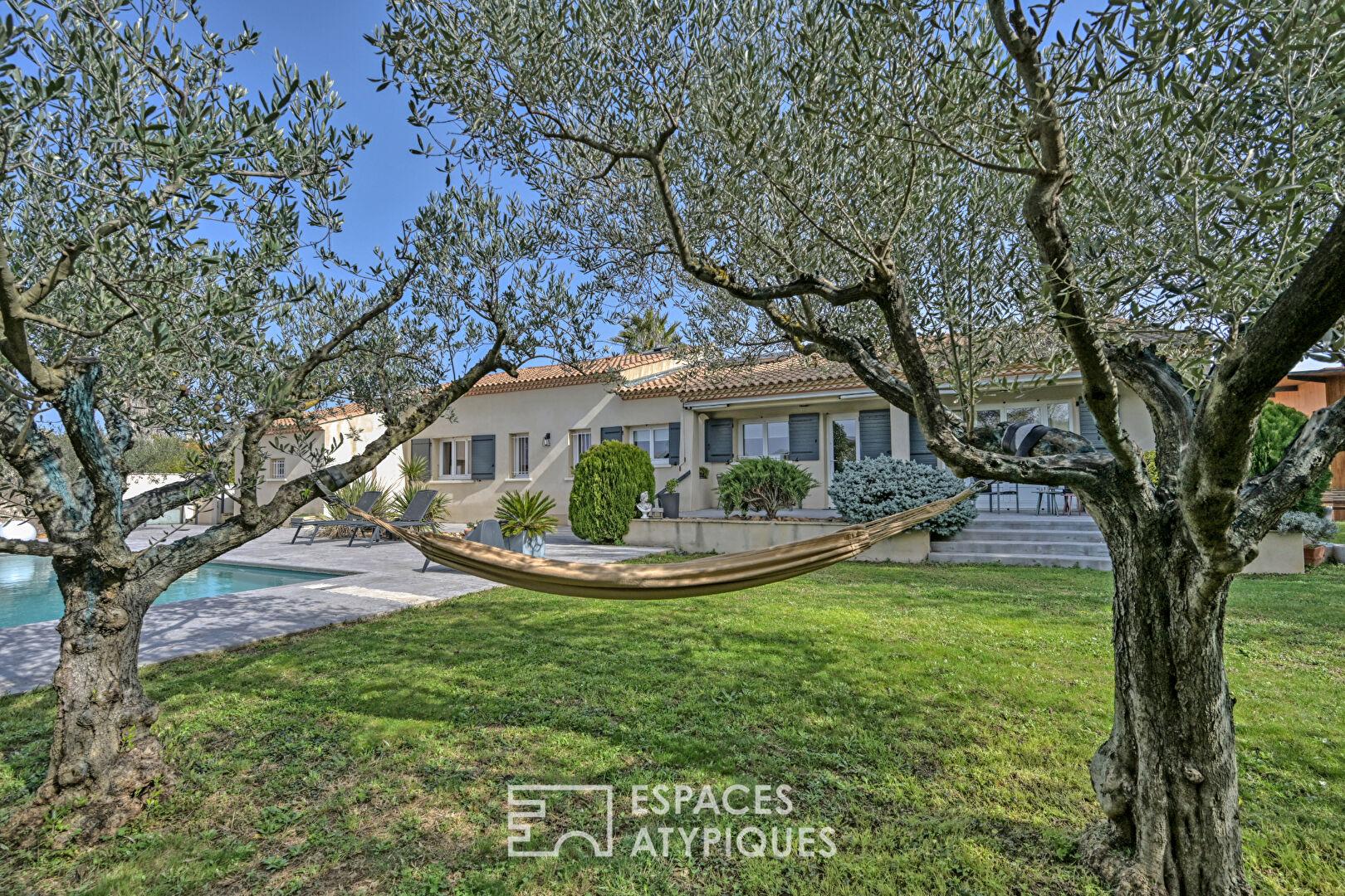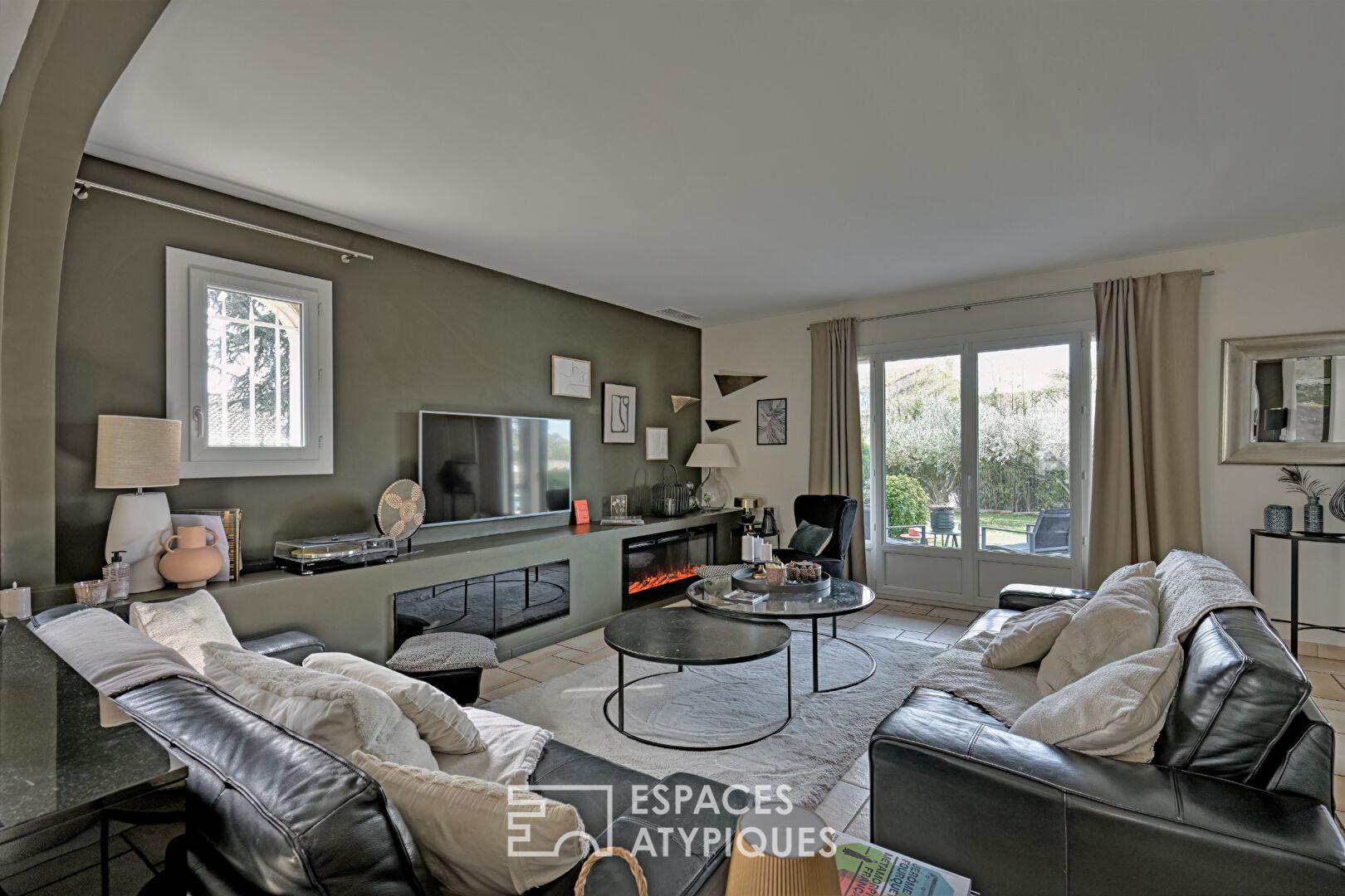 En exclusivité, dans un quartier résidentiel calme du village prisé de Caissargues, protégée par un superbe cèdre centenaire, découvrez cette maison des années 80 entièrement rénovée, traversante et baignée de lumière.