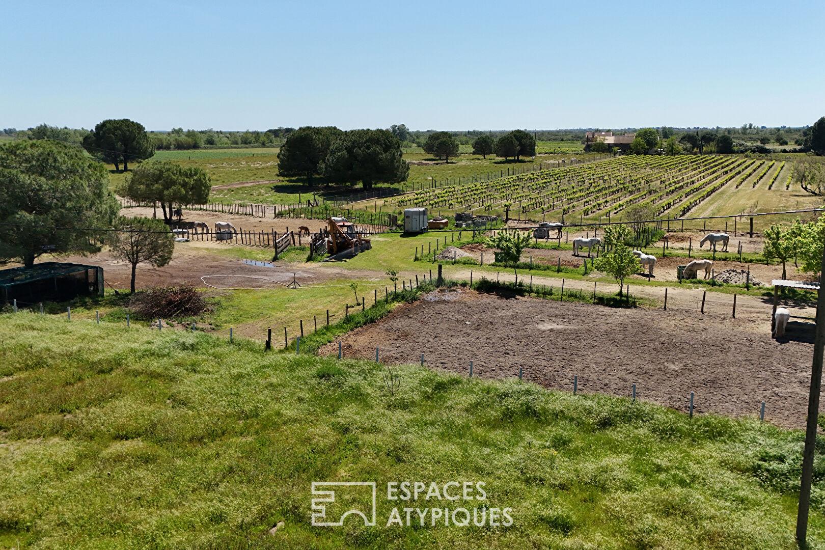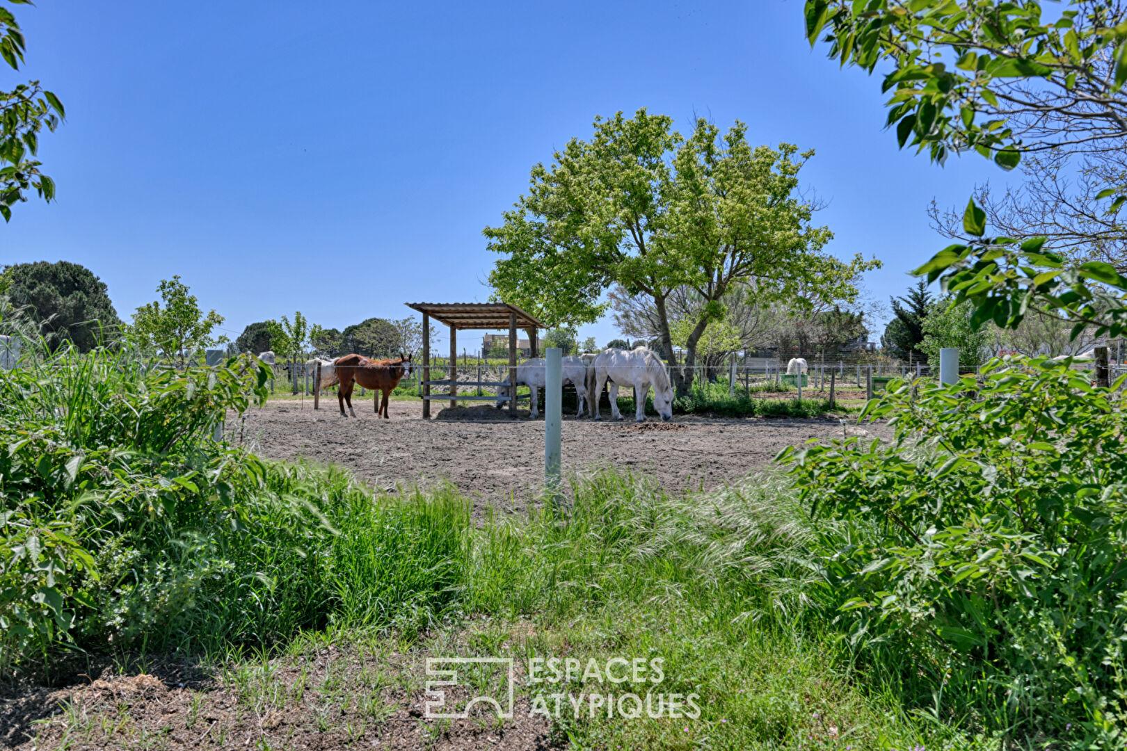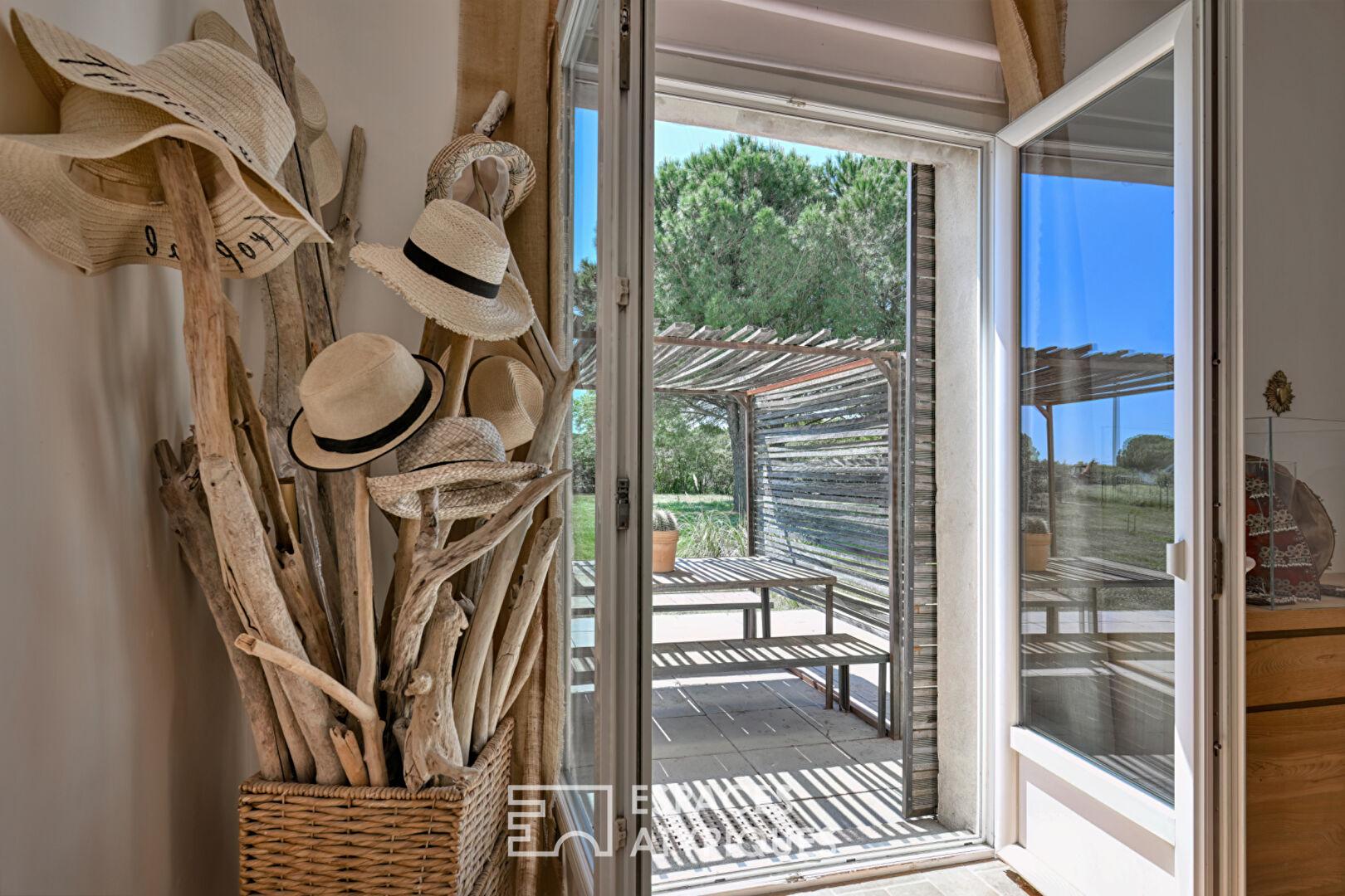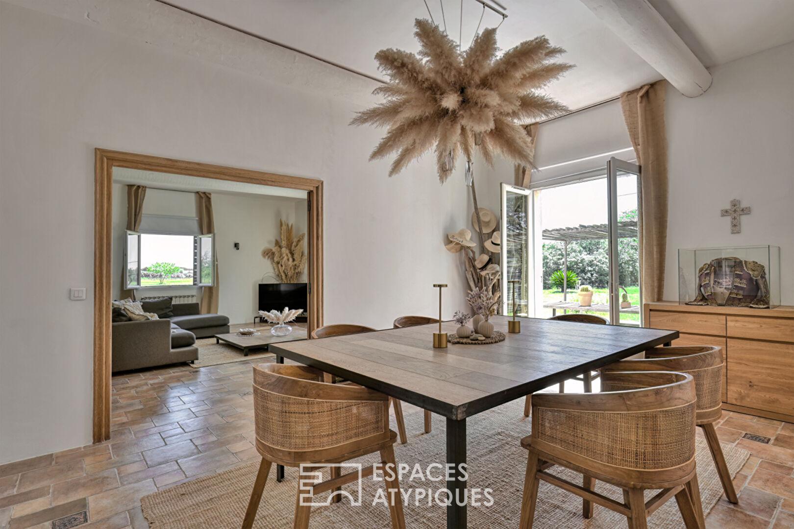 Au coeur de la petite Camargue, à quelques minutes d’Aigues-Mortes et des plages sauvages de l’Espiguette, cette bastide de 190 m² s’érige telle un secret bien gardé sur un terrain de 2,6 hectares.