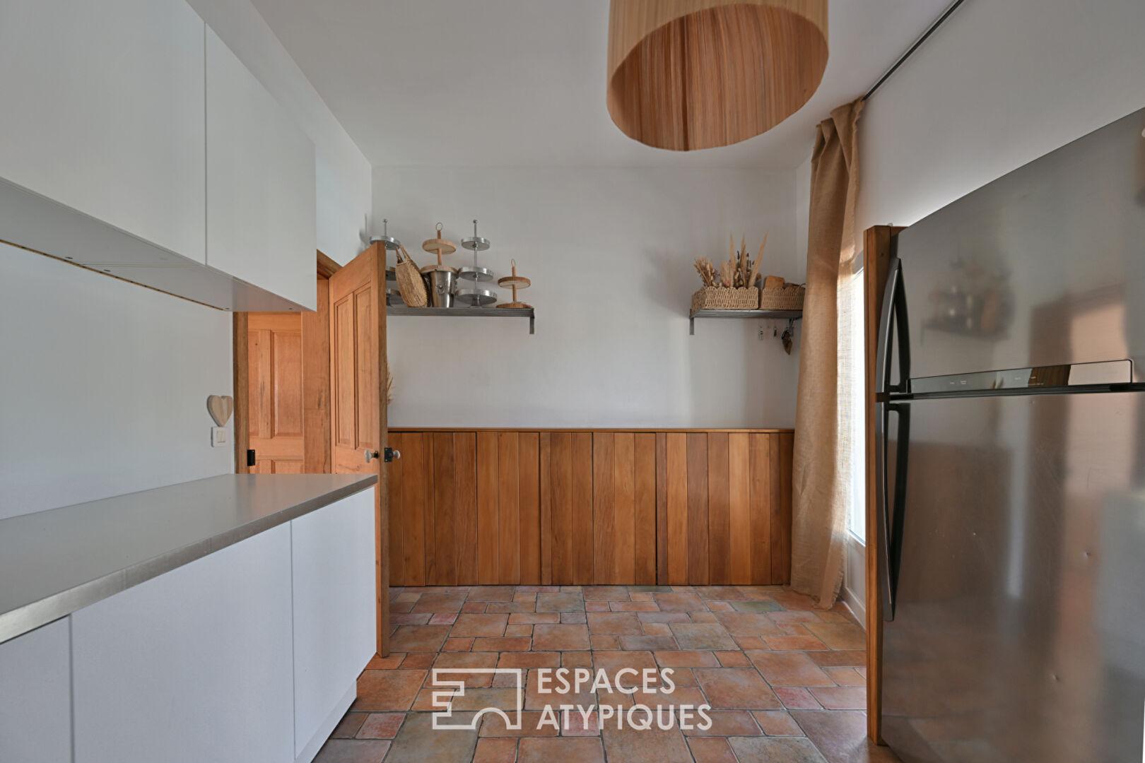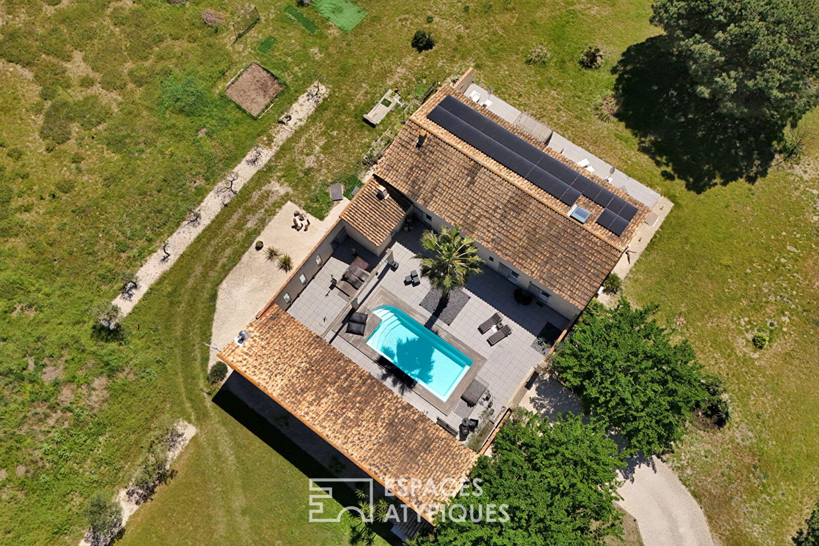 Elle a été pensée comme un lieu de vie convivial et chaleureux articulé autour d’un patio central où une piscine chauffée de 8 x 4 m dialogue avec une vaste terrasse couverte.