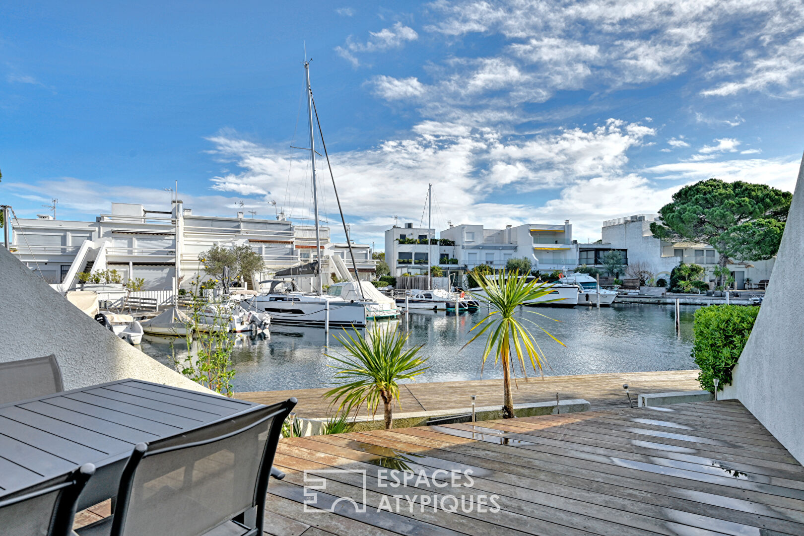 Nichée au coeur du quartier recherché de la Marina 1 à Port Camargue, cette marina entièrement rénovée déploie 76 m² habitables en duplex, offrant un art de vivre résolument tourné vers le nautisme.
