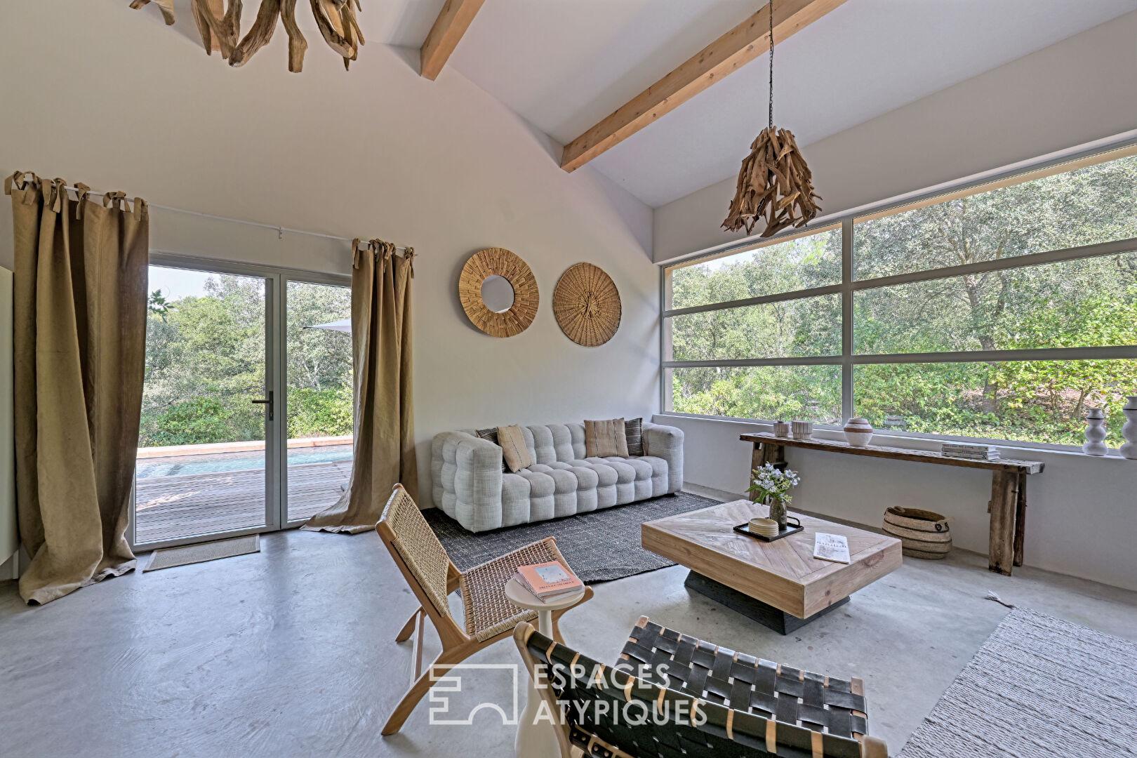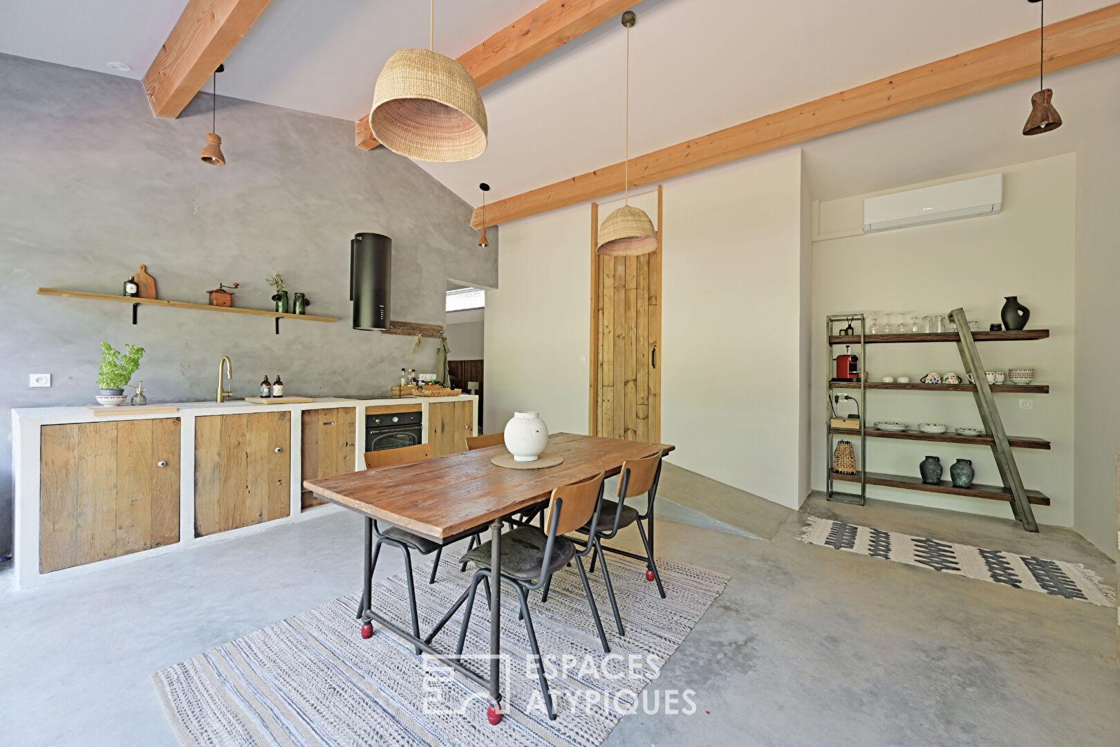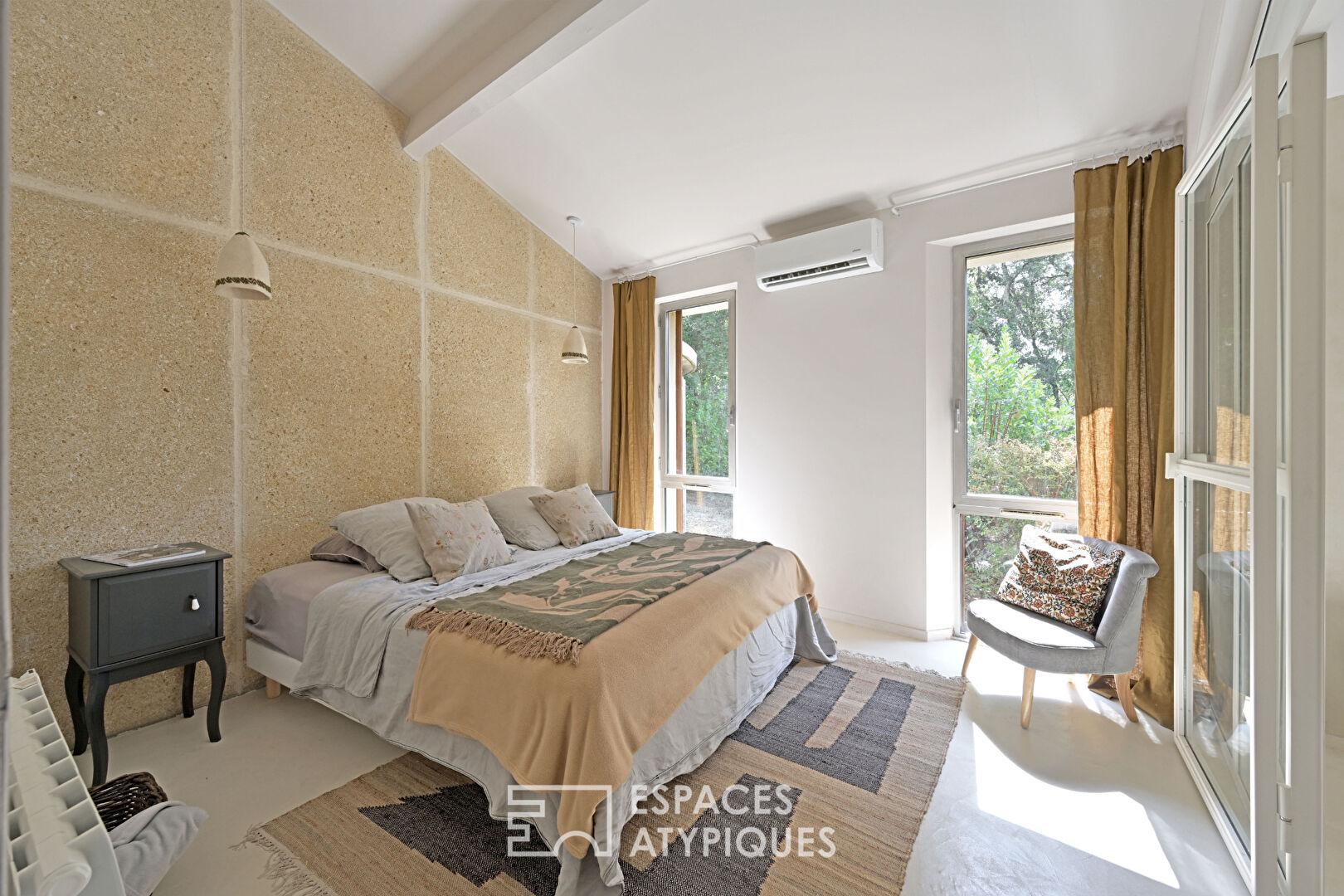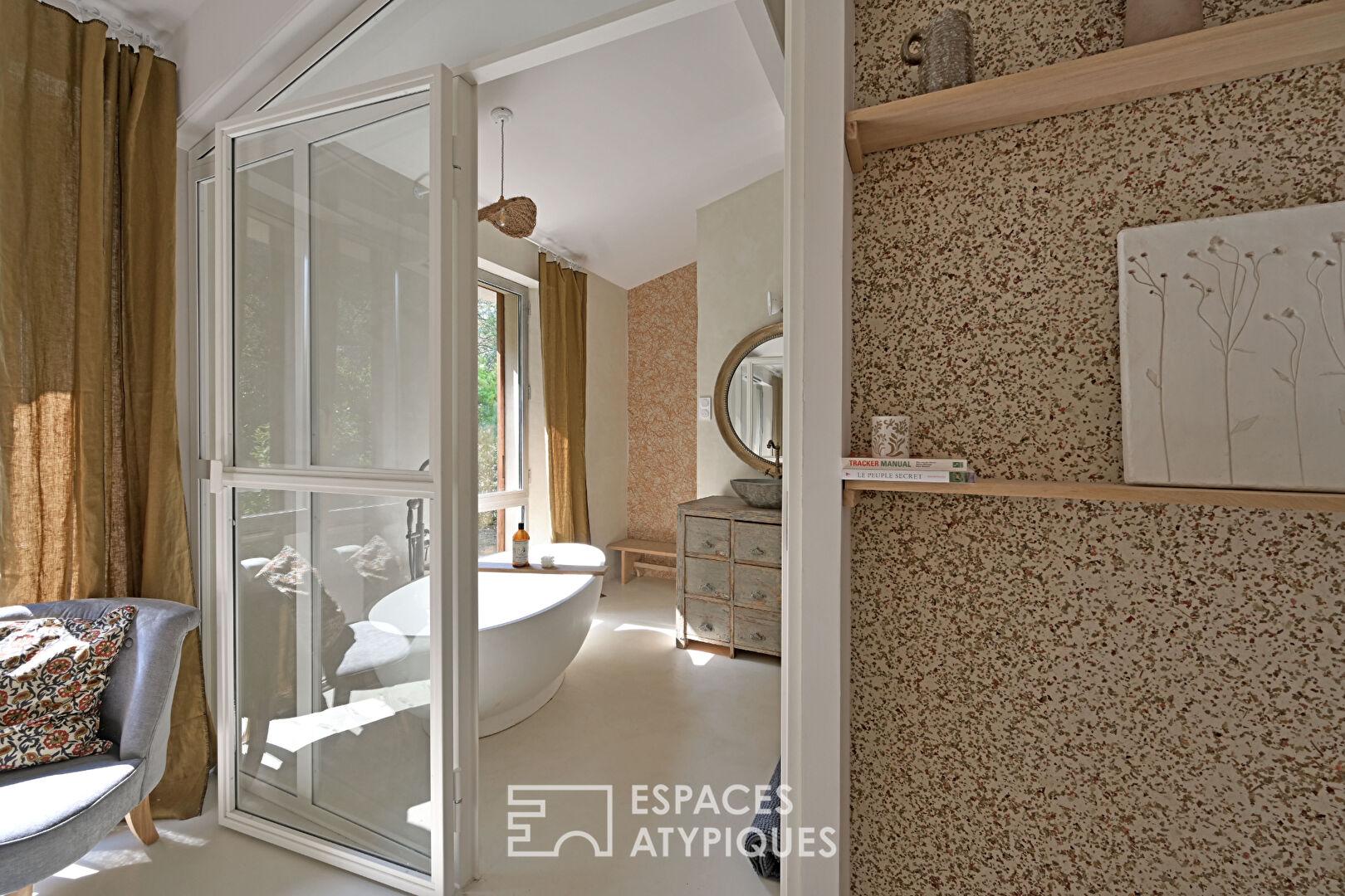 La seconde maison, ancien atelier de peintre à l’esprit loft affirmé se décline par tiers sur un peu moins de 100 m2: une sublime suite avec sa propre salle d’eau tout en transparence puis 2 espaces de vie grande hauteur éclairés par de larges ouvertures vers le jardin. Une cuisine de caractère vient compléter l’espace.