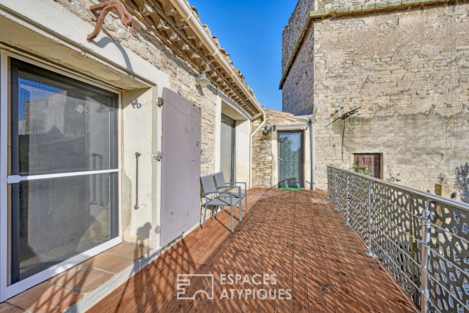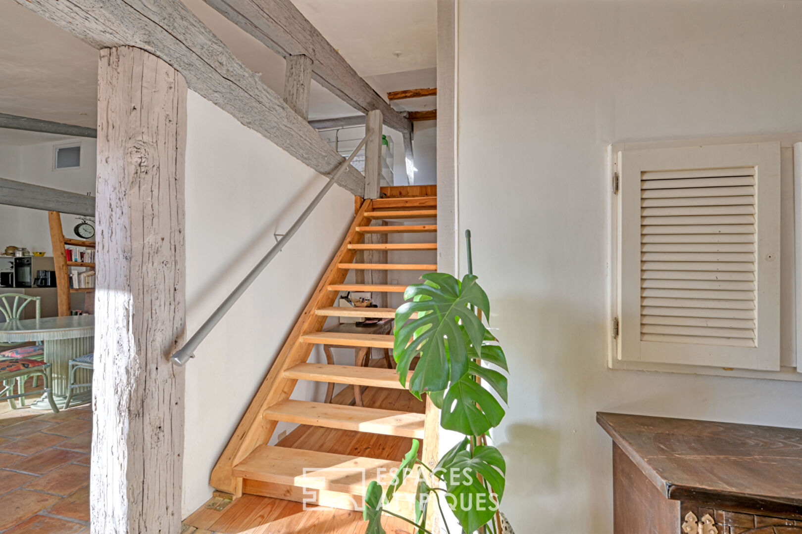 Quelques marches mènent à un espace lumineux mansardé plein de charme, où se trouvent deux chambres, dont une dotée d’une douche.