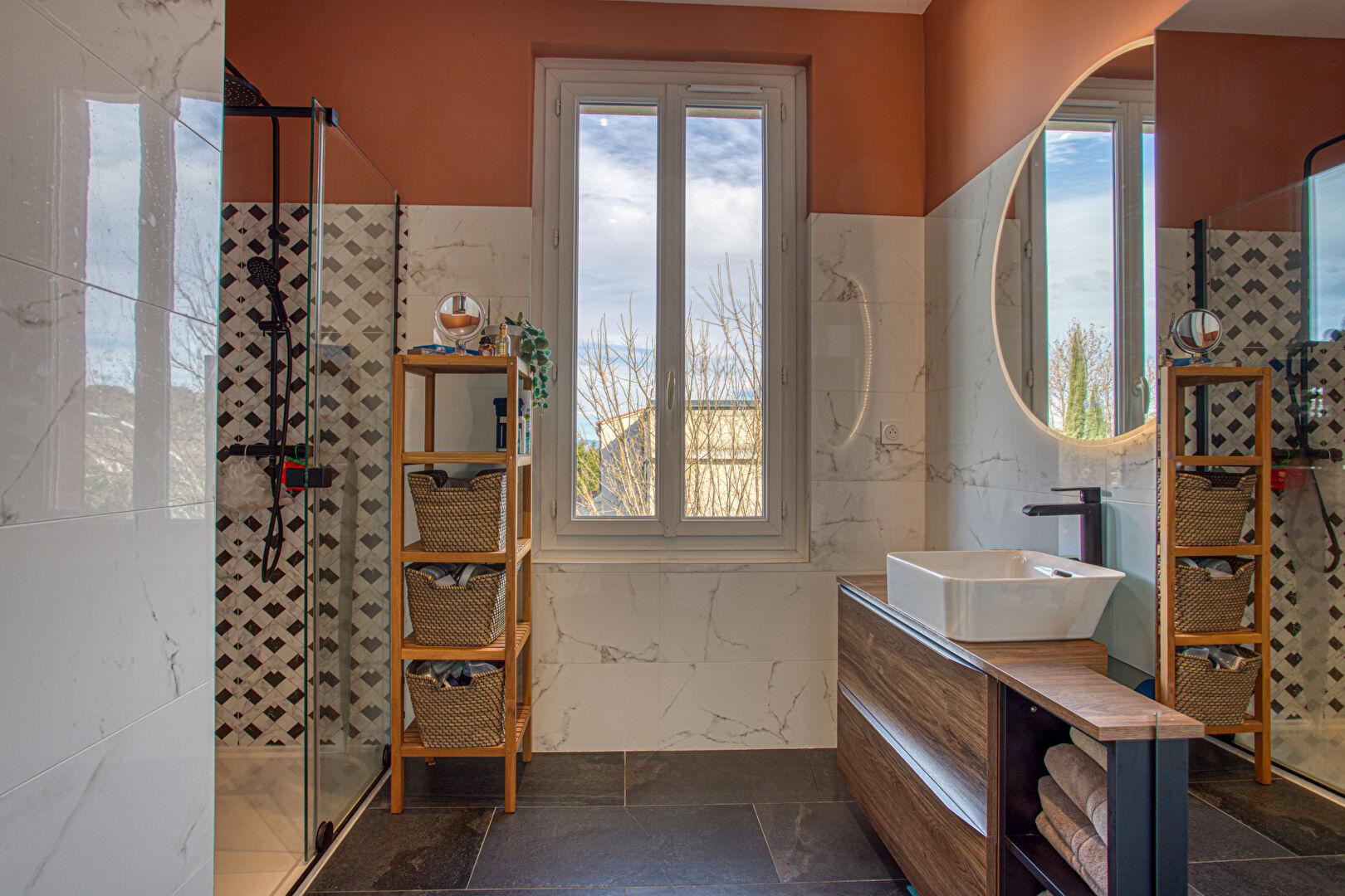À l’extérieur, le jardin arboré et la piscine créent un écrin de verdure intime, parfait pour profiter du climat méditerranéen. La piscine s’intègre harmonieusement dans cet environnement verdoyant, propice à la détente et aux moments partagés.