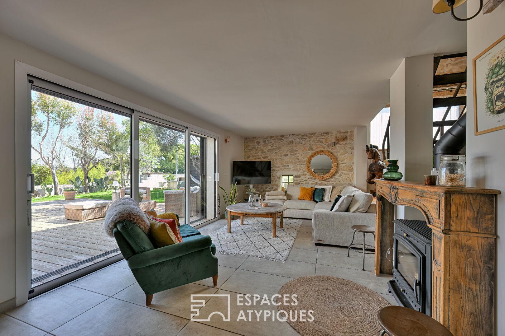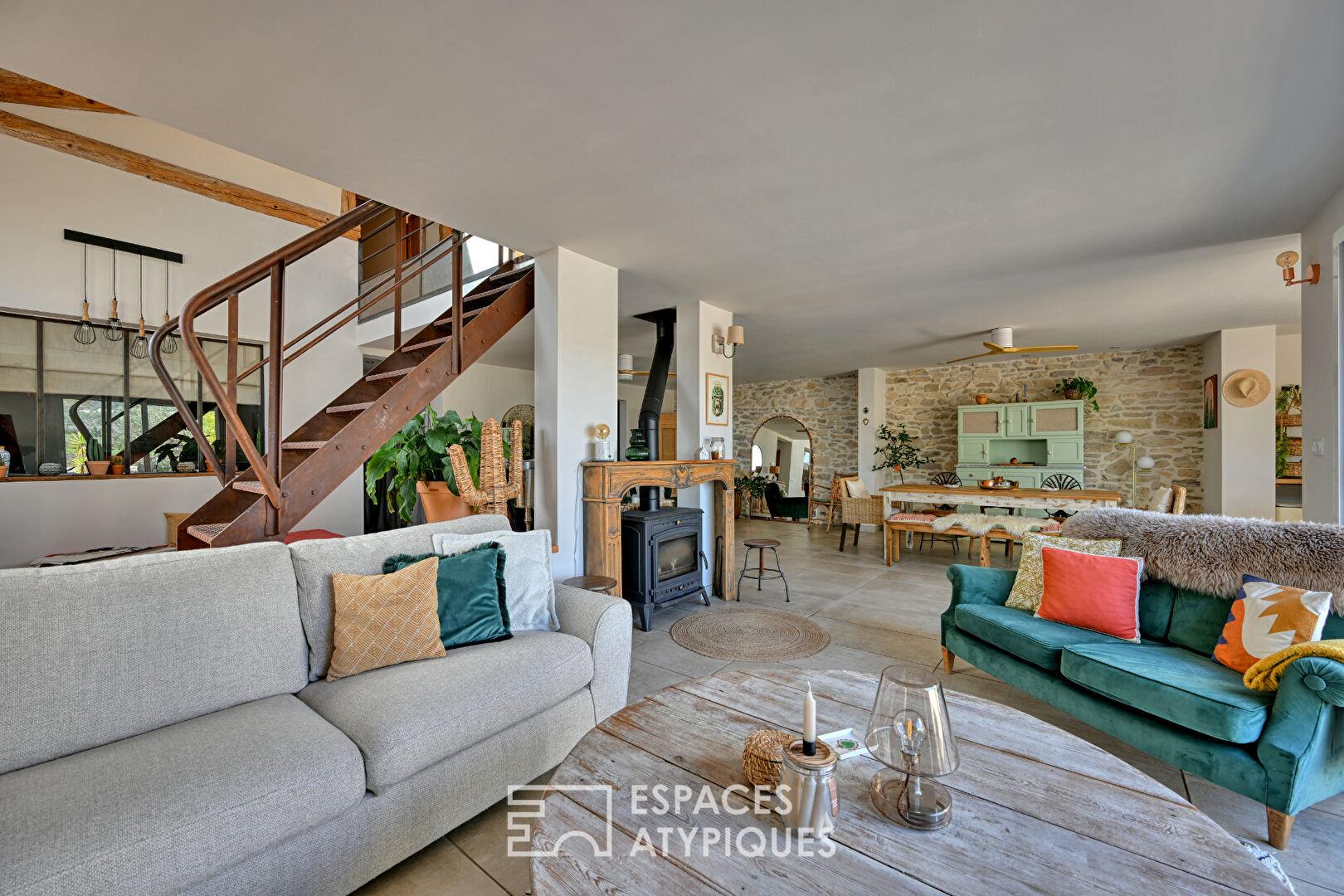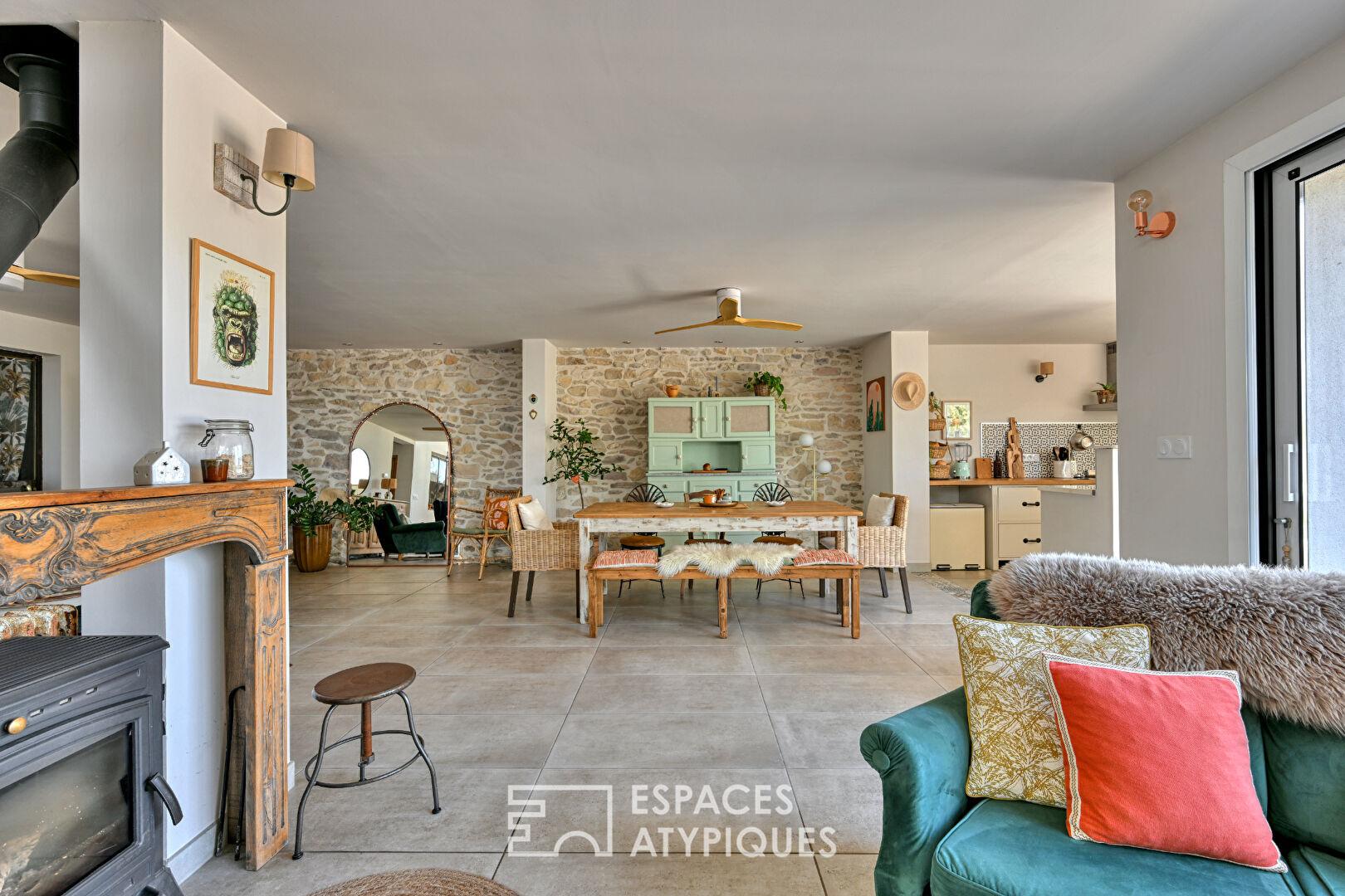 Dès l’entrée, la magie opère : volumes généreux, lumière naturelle omniprésente et atmosphère chaleureuse créent une sensation immédiate de bien-être. La pièce de vie, largement ouverte sur l’extérieur grâce à de grandes baies vitrées, prolonge l’espace jusqu’au jardin et offre un dialogue permanent entre dedans et dehors. Ici, pierres apparentes, poutres authentiques et lignes contemporaines se répondent, donnant naissance à un lieu à la fois élégant, accueillant et unique.