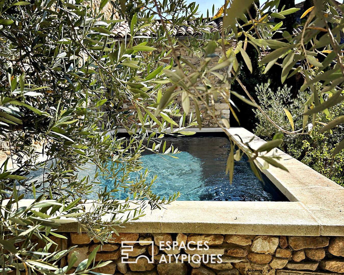 À l’extérieur, le jardin paysagé et clos de murs se vit comme une parenthèse confidentielle, à l’abri des regards. Le bassin de 8 x 3 s’y inscrit avec discrétion, promesse de parenthèses ensoleillées et de farniente bercée par le chant des cigales.