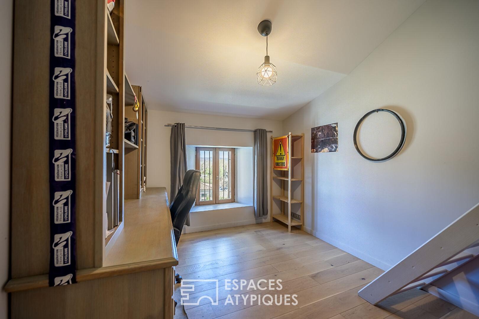 Un escalier majestueux dessert les 2 autres niveaux. Le 1er étage, véritable coeur battant de la maison, offre un espace de vie baigné de lumière, chaleureux par son poêle à bois double face où salon et salle à manger communiquent avec une cuisine ouverte très contemporaine. Ce niveau se prolonge vers une exceptionnelle terrasse couverte de 78 m², véritable pièce de vie extérieure aux allures de loggia. Un bureau et une petite chambre avec salle d’eau le complète.