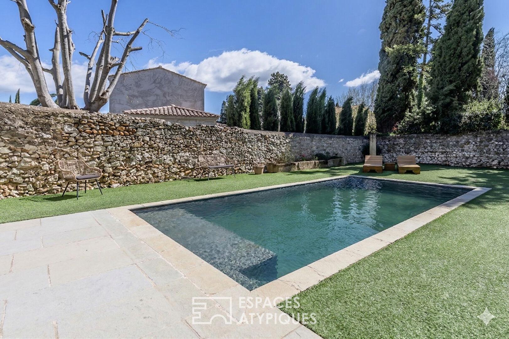 L’extérieur est une invitation à la sérénité. Rare en centre-village, il révèle un jardin clos de murs en pierres sèches abritant une piscine aux teintes naturelles et aux lignes épurées. Ce havre de paix, permet de profiter de la douceur du climat gardois à quelques pas des commerces et des écoles.