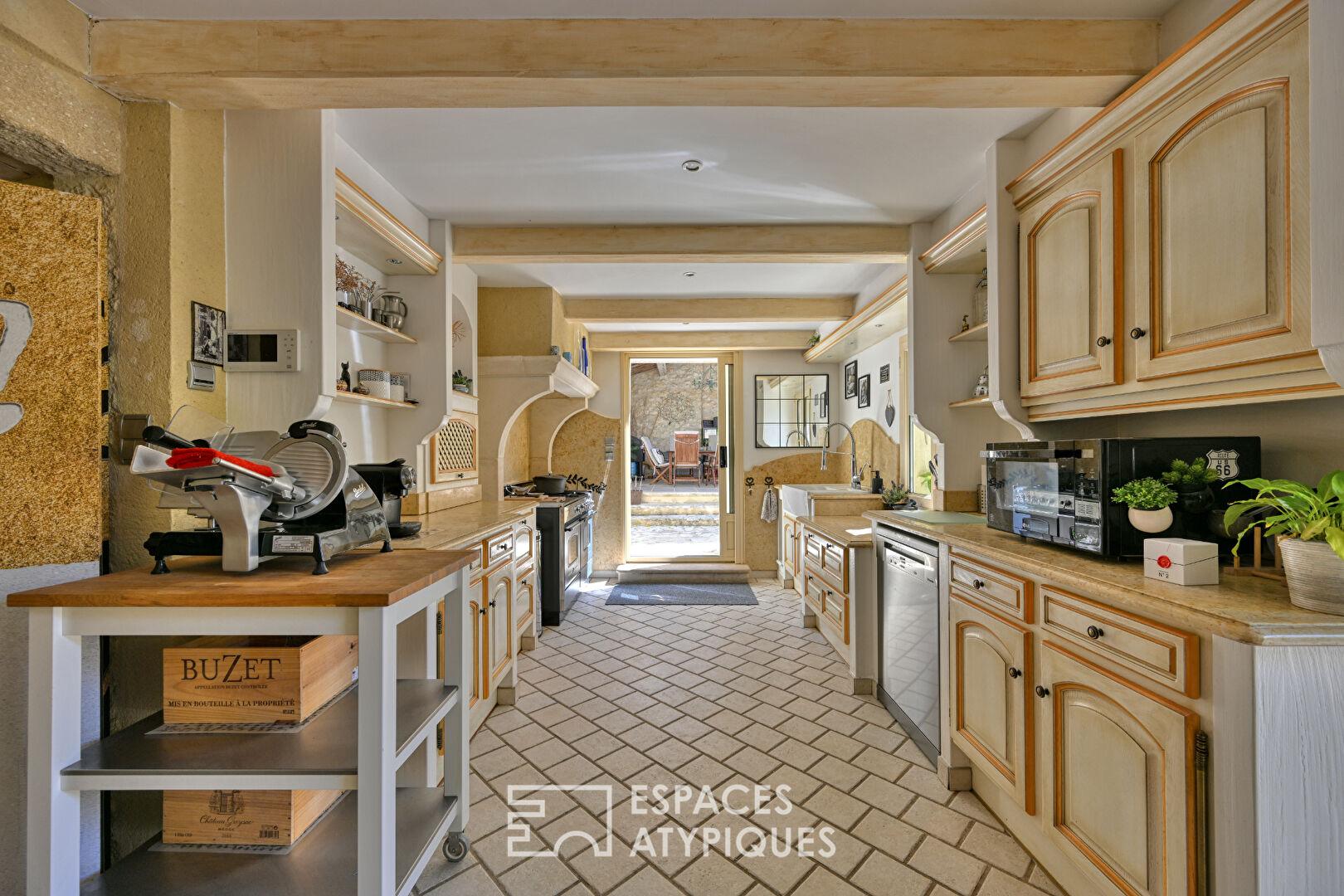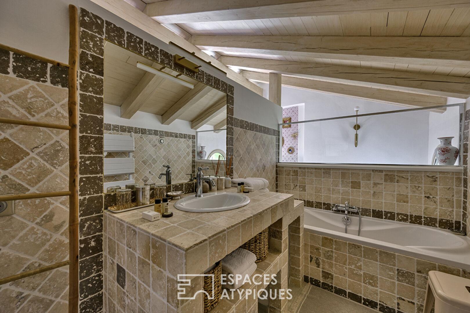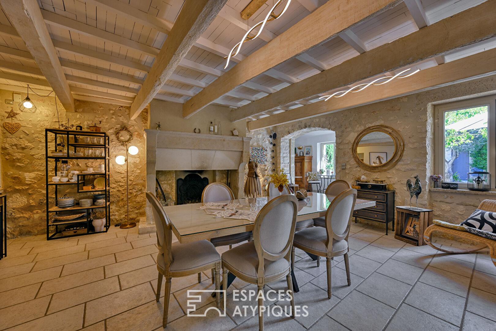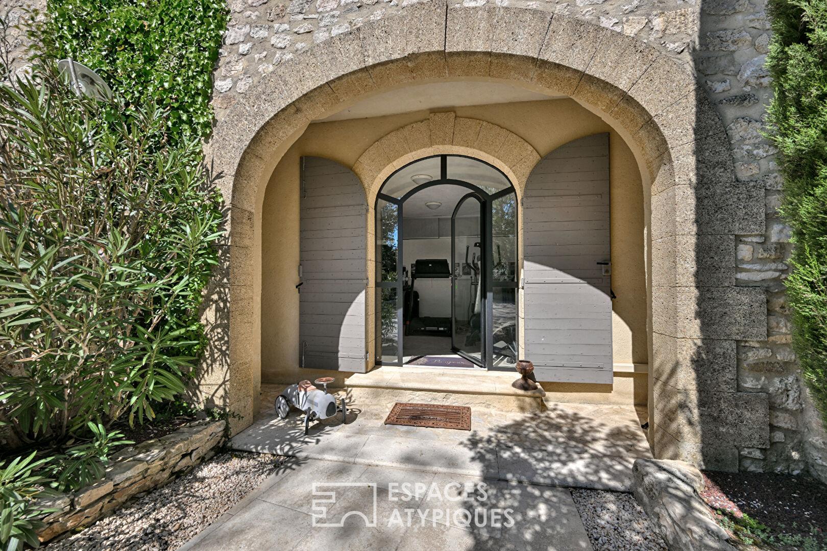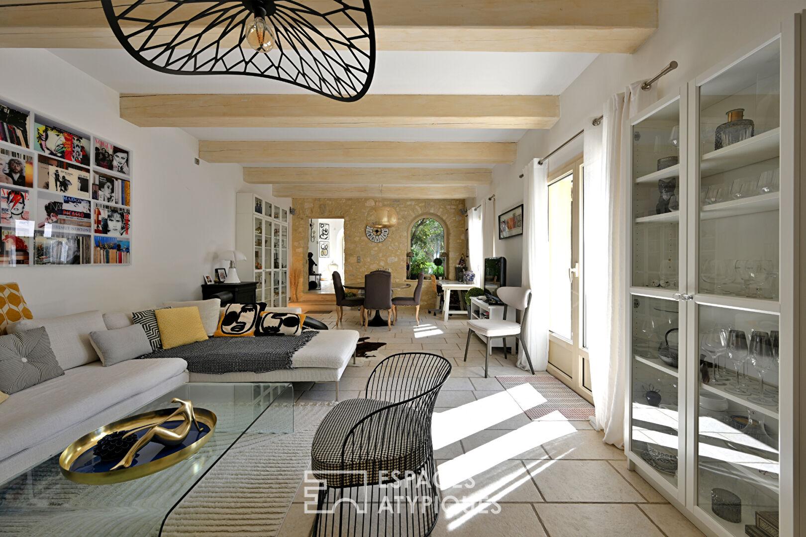 Dès la cour, l’écriture du lieu s’impose sans ostentation : la pierre, brute et vivante, s’accorde à des interventions contemporaines parfaitement maîtrisées. Rien n’est figé, tout est équilibre.