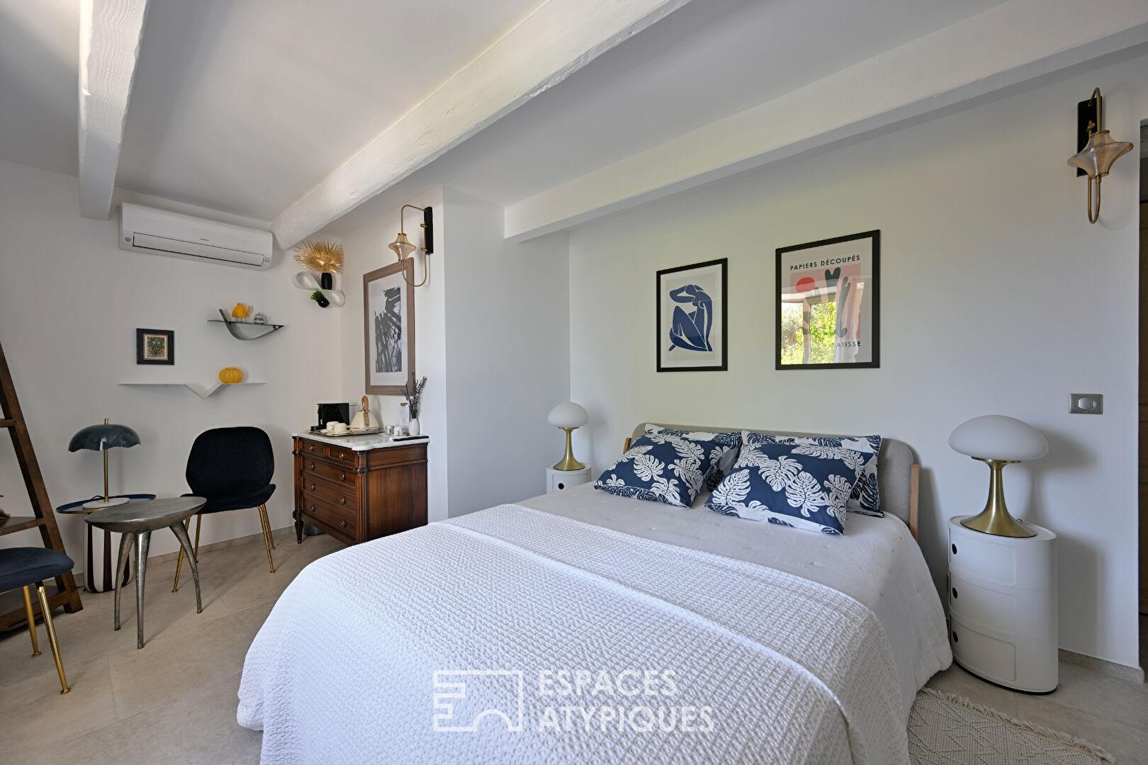 À l’extérieur, la piscine chauffée s’inscrit avec évidence dans le paysage. À proximité, un mazet indépendant abrite une suite supplémentaire, ouverte sur une terrasse ombragée sous une treille, un espace autonome, idéal pour recevoir ou s’extraire du rythme principal de la maison.
