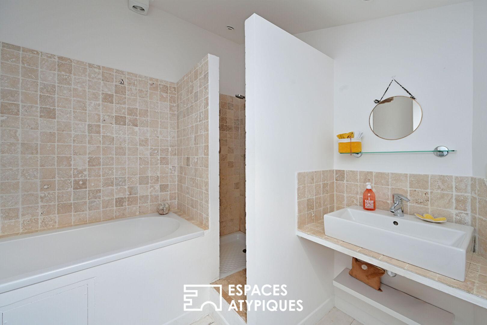 Un vestibule, propice à la réflexion ou à la création, relie ces pièces de vie à une chambre intime de 12 m². Il pourrait se transformer en une salle de bain supplémentaire, si le besoin s’en faisait sentir.