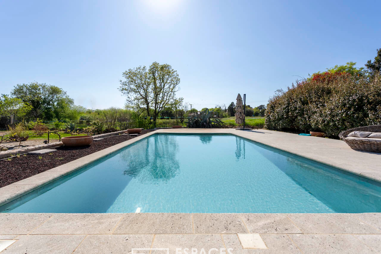 D’une surface de 1335 m2 le terrain abrite également une piscine 9×4 ainsi qu’un petit bassin à nénuphar.