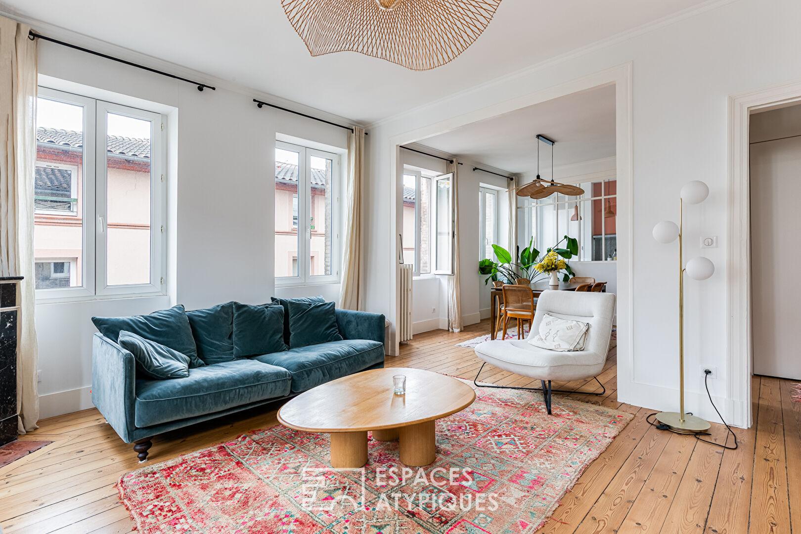 A deux pas de la Place Dupuy à Toulouse, cet appartement de caractère propose 84.61m² carrez rénovés avec goût.