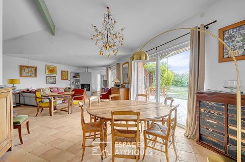 L’ensemble est baigné de lumière grâce à ses larges baies vitrées s’ouvrant sur la terrasse et son jardin.