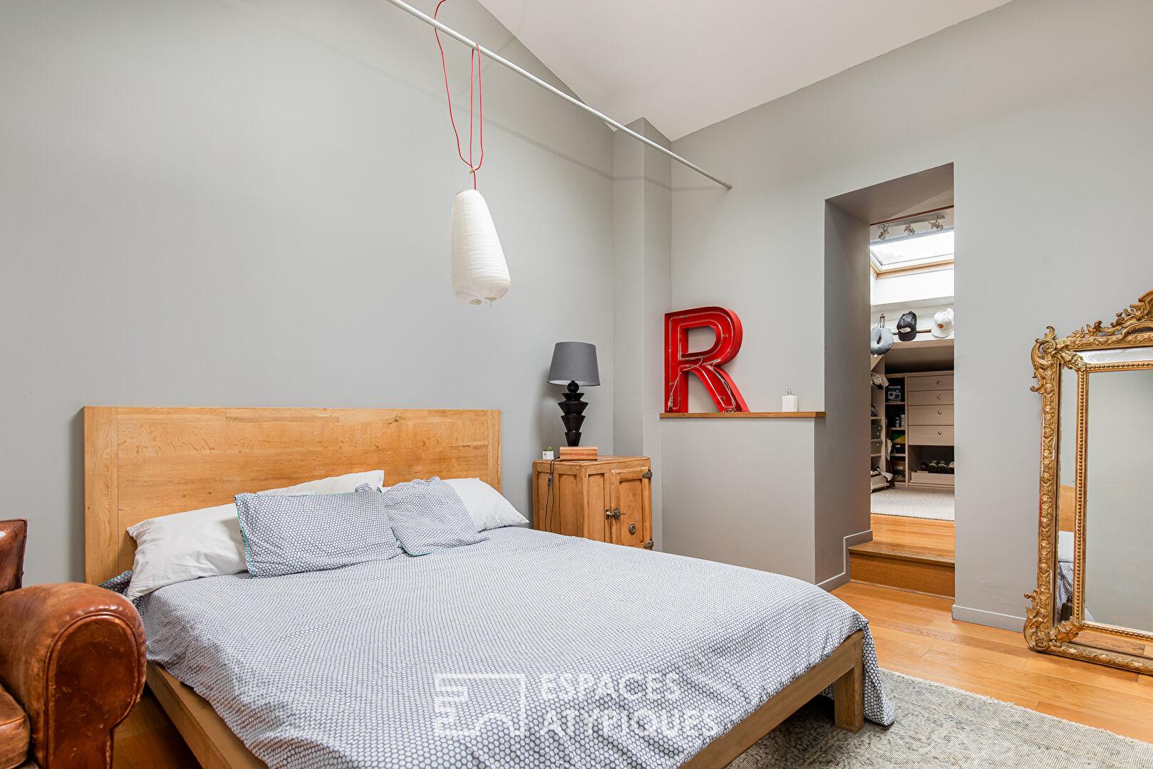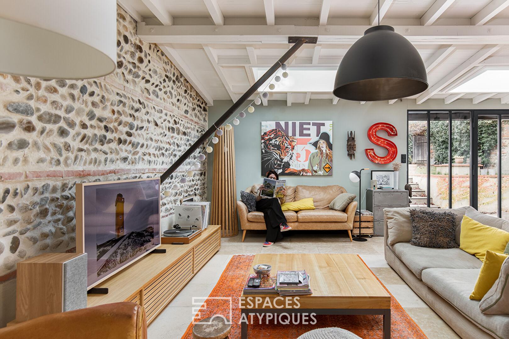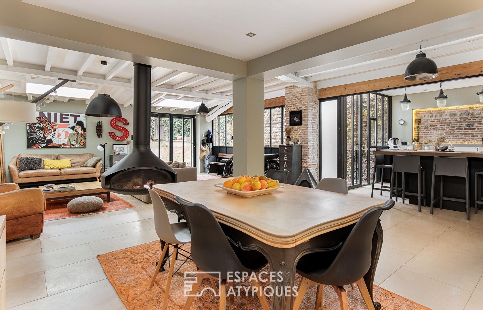 Au bout du couloir se trouve une belle pièce de vie, qui comprend un séjour lumineux et une cuisine ouverte idéalement conçue. Une cheminée focus dirigeable, habile séparation entre le salon et la salle à manger, apporte un véritable sentiment de convivialité. La brique et les poutres apparentes amènent du caractère à l’ensemble. Les grandes baies vitrées de type atelier amènent à une terrasse en bois et à un jardin piscinable.