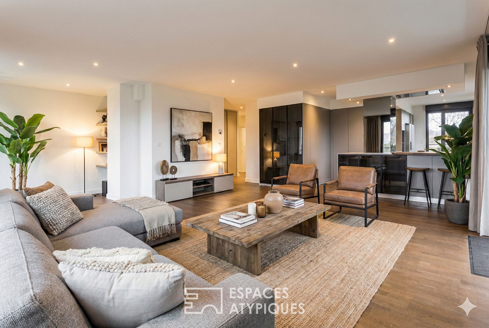 L’entrée dévoile une vaste pièce de vie de près de 50 m², où le parquet chaleureux en chêne massif dialogue avec une décoration aux tons sobres et élégants.