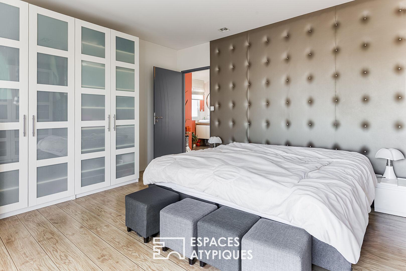 À l’étage, les 4 chambres offrent des volumes confortables. La suite parentale composée d’un grand dressing et d’une salle de bain avec douche et baignoire profite également d’une terrasse privative avec vue plongeante sur la piscine entourée de la terrasse, créant un espace à part.