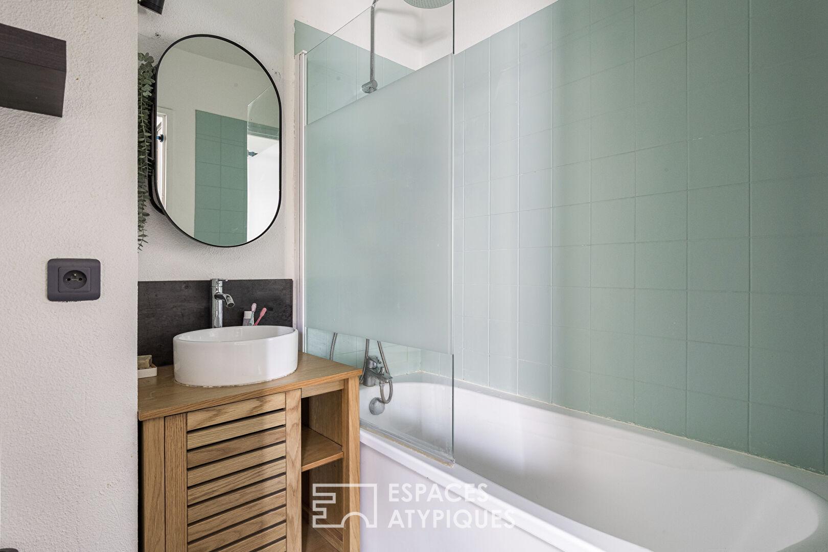 Le séjour se prolonge vers l’extérieur grâce à un balcon ensoleillé, idéal pour profiter de moments de détente en retrait de l’agitation citadine.