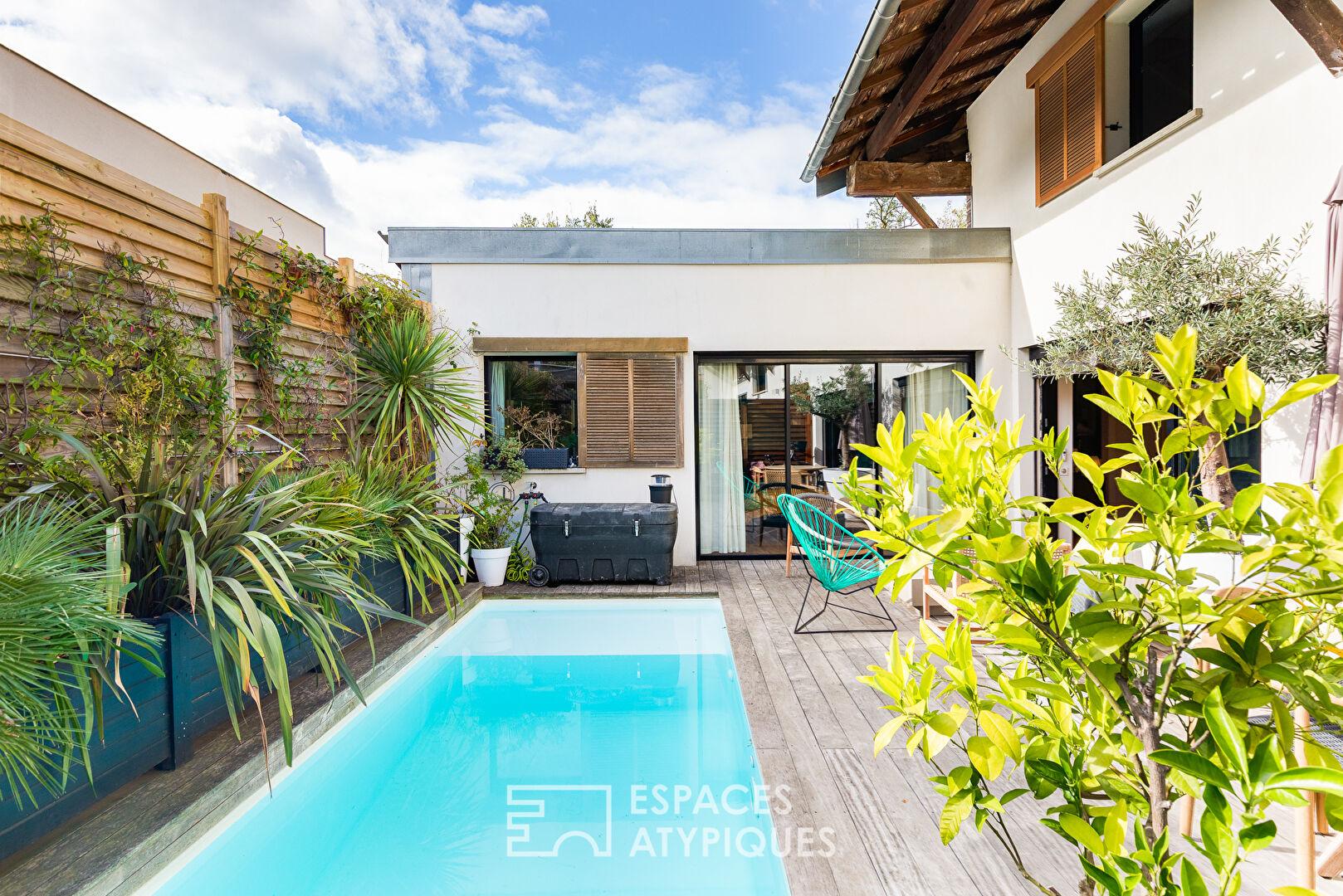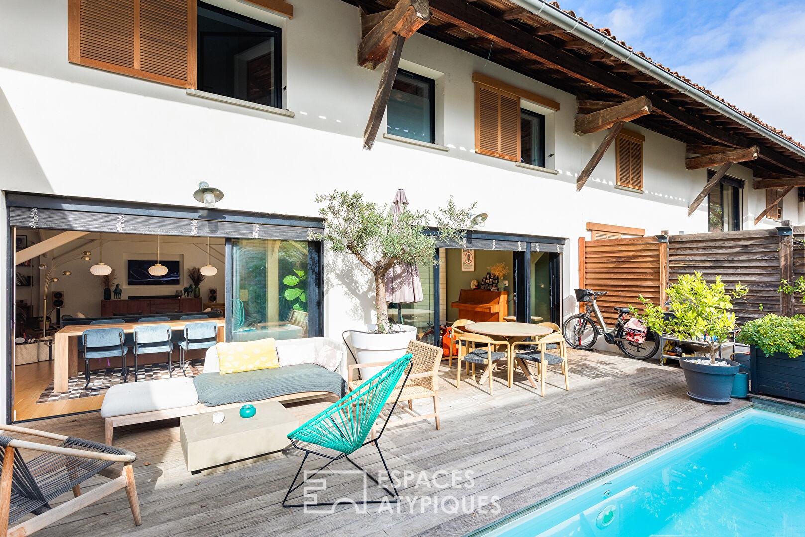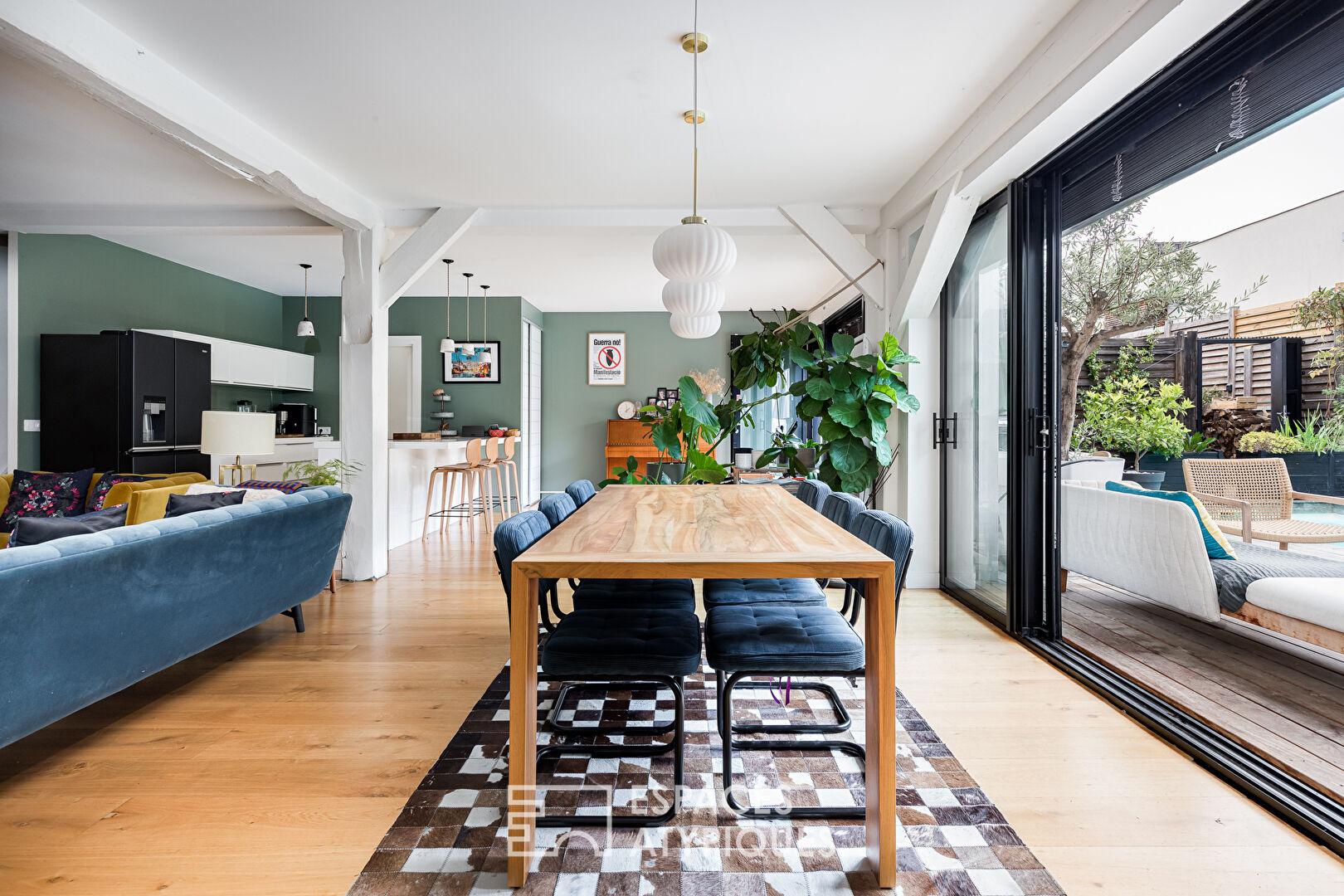 Entièrement repensée dans un esprit contemporain, cette propriété unique se compose d’une maison principale d’environ 214 m² et de deux dépendances totalisant 75 m², implantées dans un jardin arboré avec piscine chauffée et stationnement pour deux véhicules.