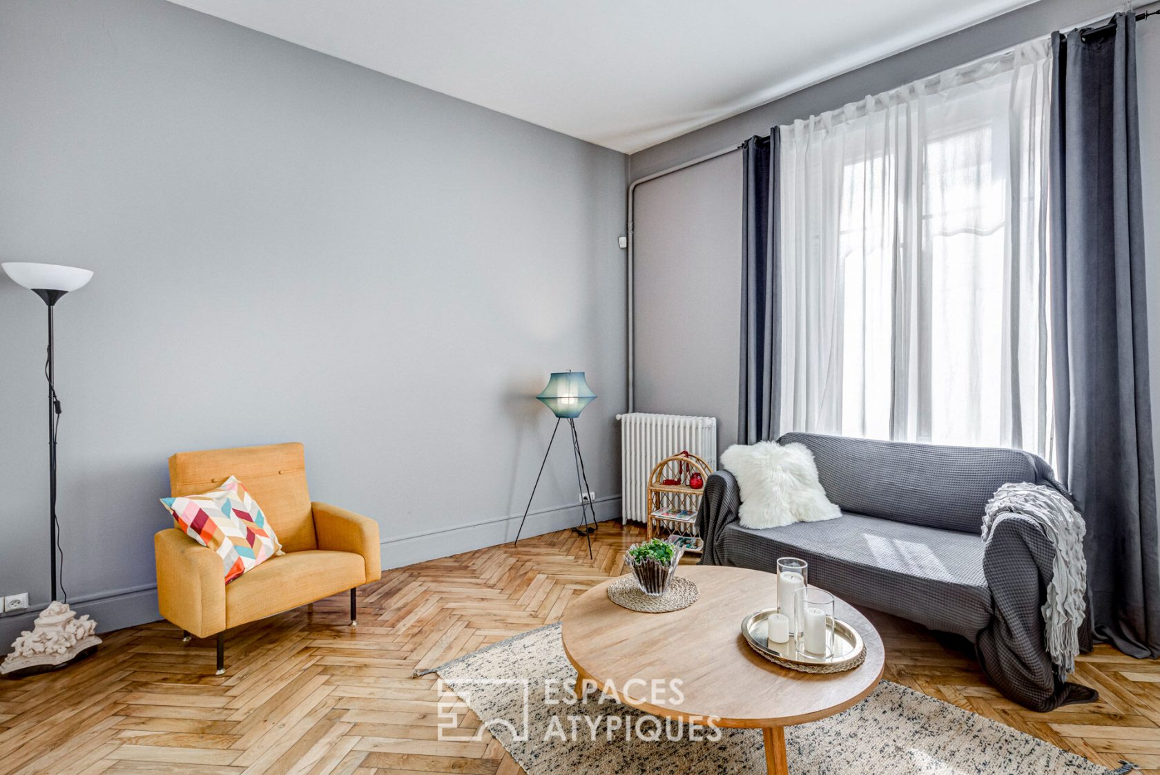 Dès l’entrée, le parquet en point de Hongrie rappelle l’authenticité des lieux. La hauteur sous plafond de 3,30 mètres et le charme des briques foraines dans chaque pièce donnent un réel cachet à ce bien de caractère.