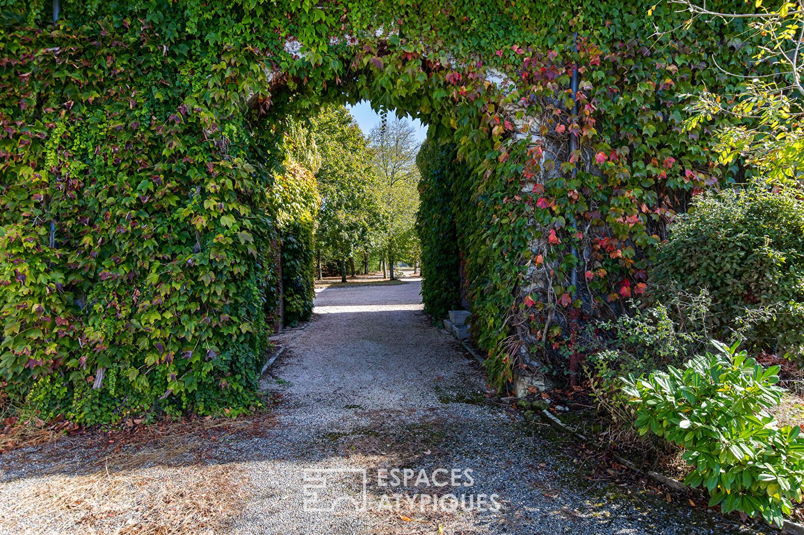 Un imposant portail mène à l’allée boisée laissant découvrir petit à petit le caractère de cette bâtisse.