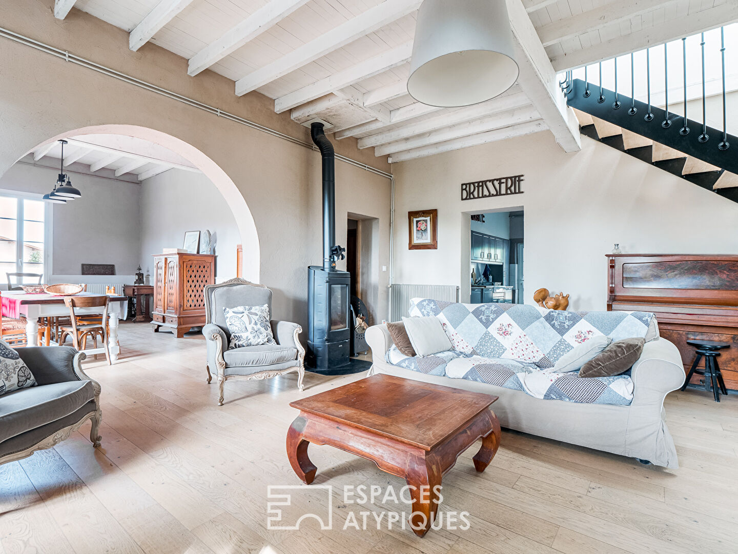 L’entrée ouvre sur la pièce de vie. Les volumes impressionnent, 100m² répartis entre le séjour / salle à manger et la cuisine.
