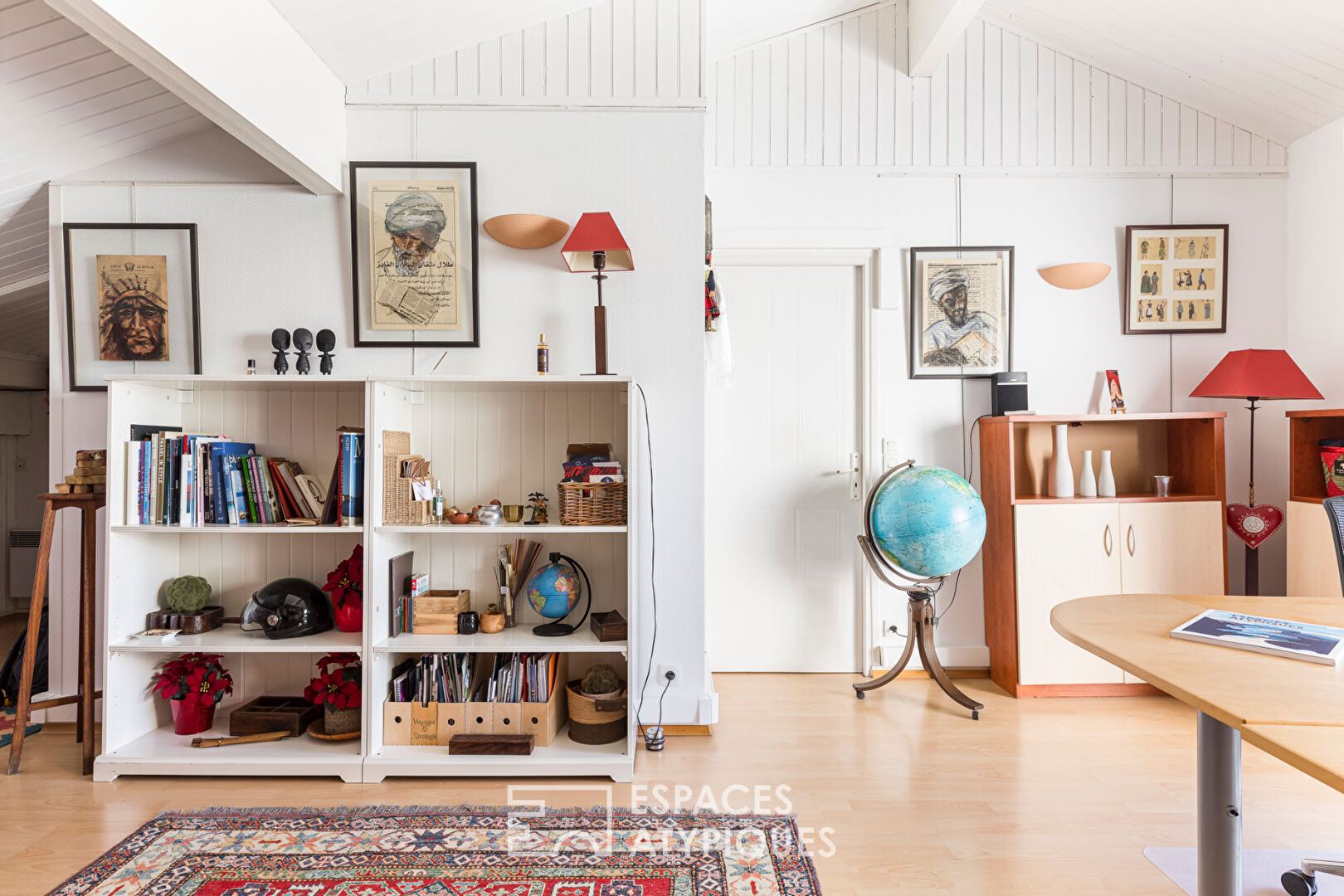 Actuellement aménagé en bureau, il offre une grande flexibilité d’usage, pouvant aussi bien accueillir une activité professionnelle qu’être repensé en un lieu de vie chaleureux.