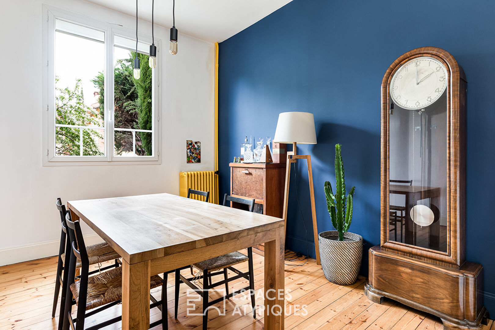 Derrière la façade sobre typique de l’architecture toulousaine des années 1930, l’entrée s’ouvre sur un espace de vie lumineux et généreux. Organisé autour d’une cheminée d’époque et baigné de lumière grâce à de larges ouvertures sur le jardin, le salon est structuré par des pièces iconiques telles qu’un canapé Togo et des suspensions au design industriel.