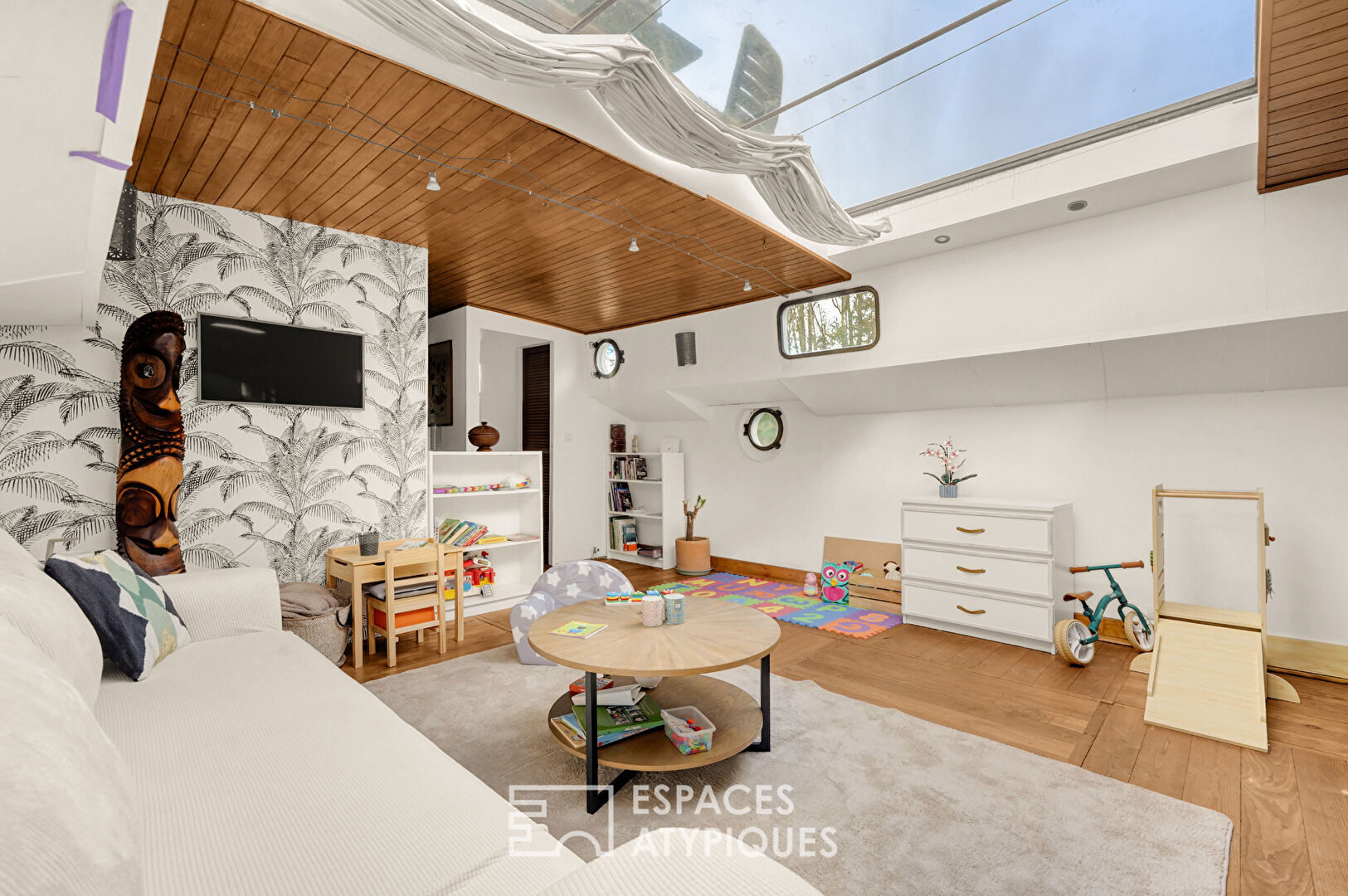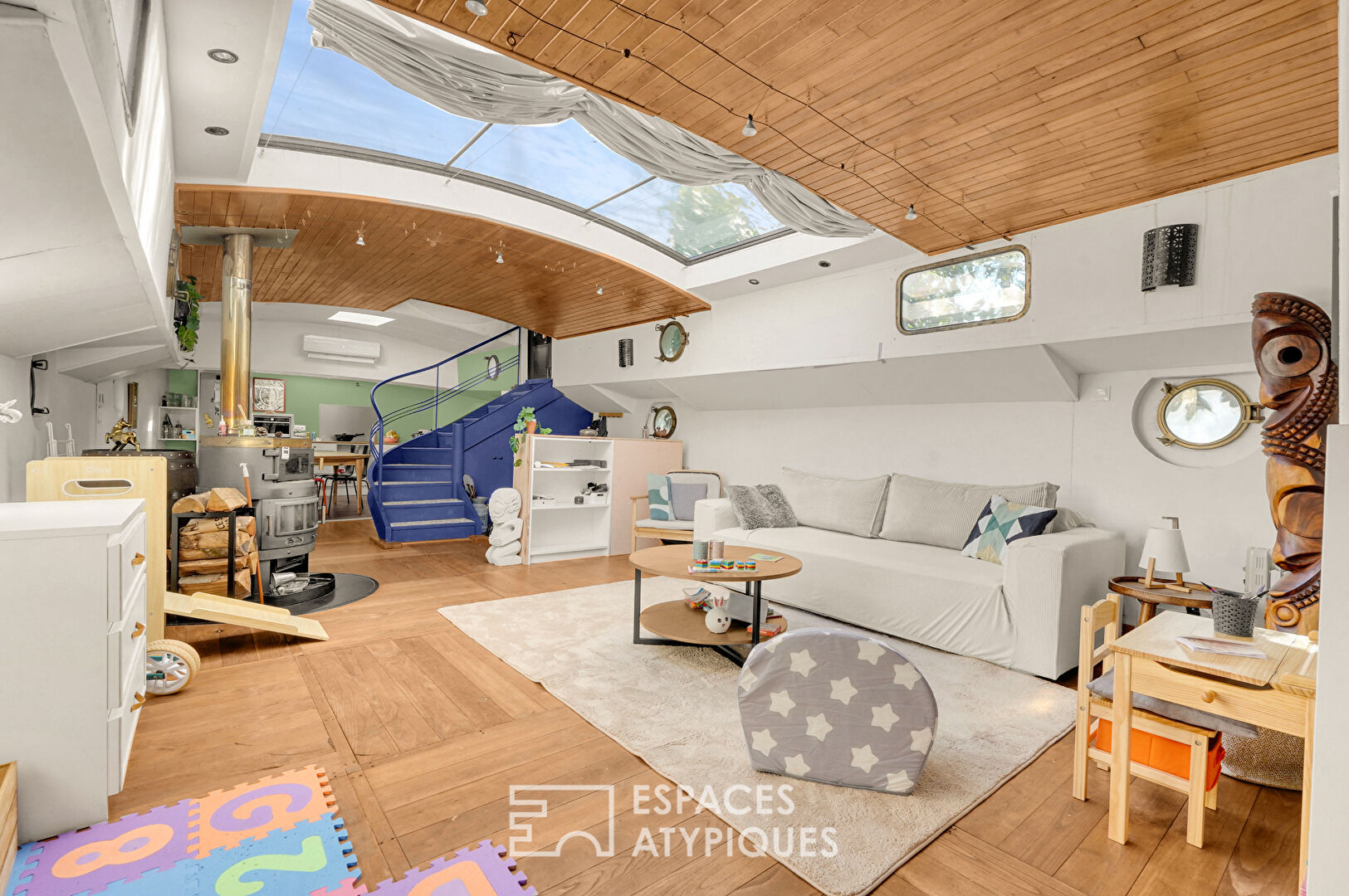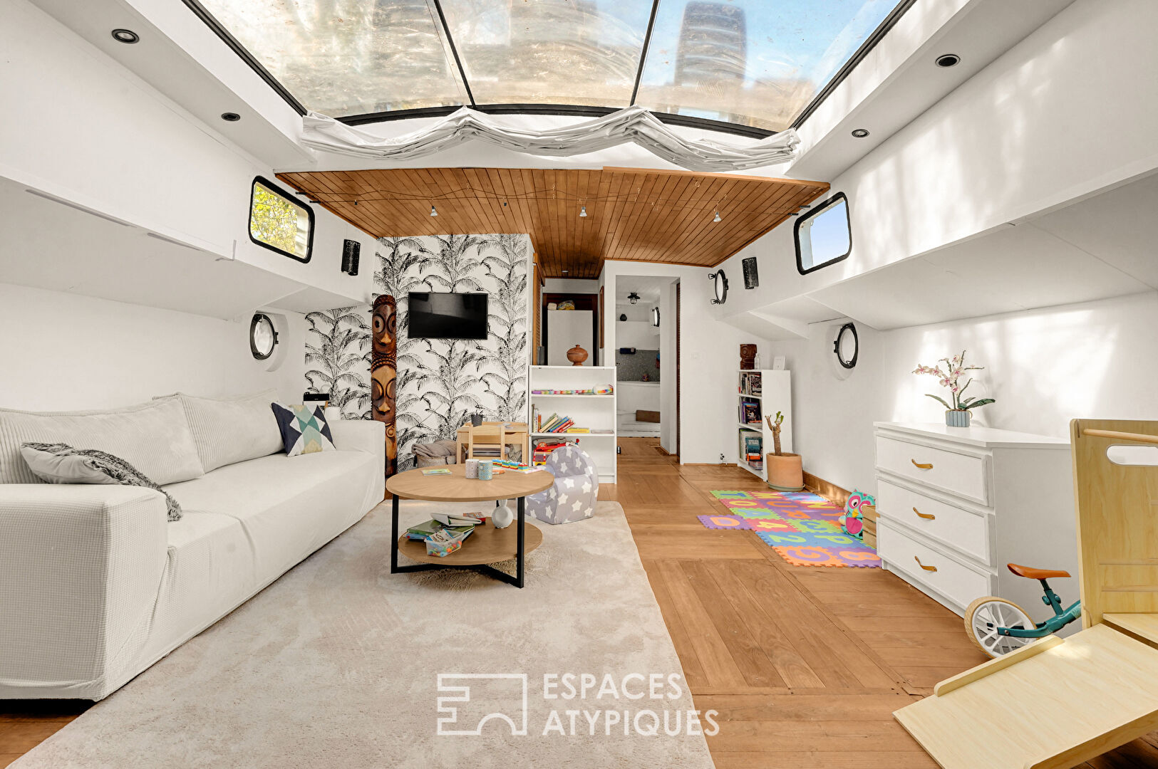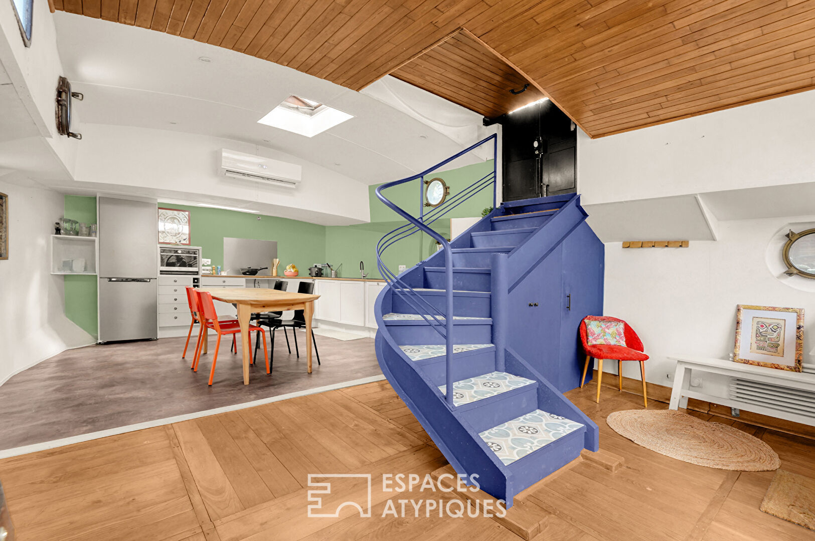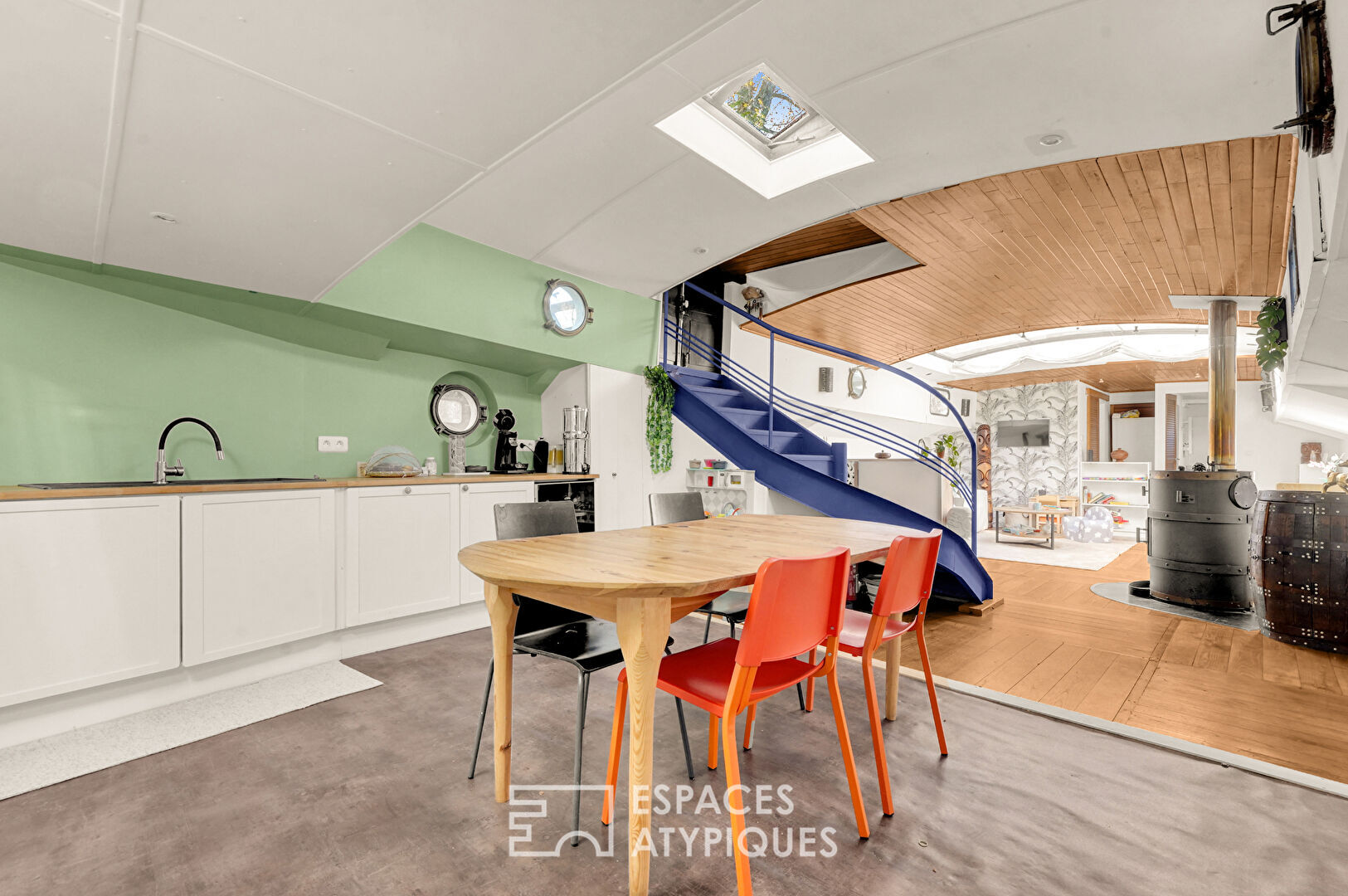 En partie rénovée, elle bénéficie du « Label Bateau d’Intérêt Patrimonial », offrant une expérience de vie rare, à mi-chemin entre habitat contemporain et authenticité.