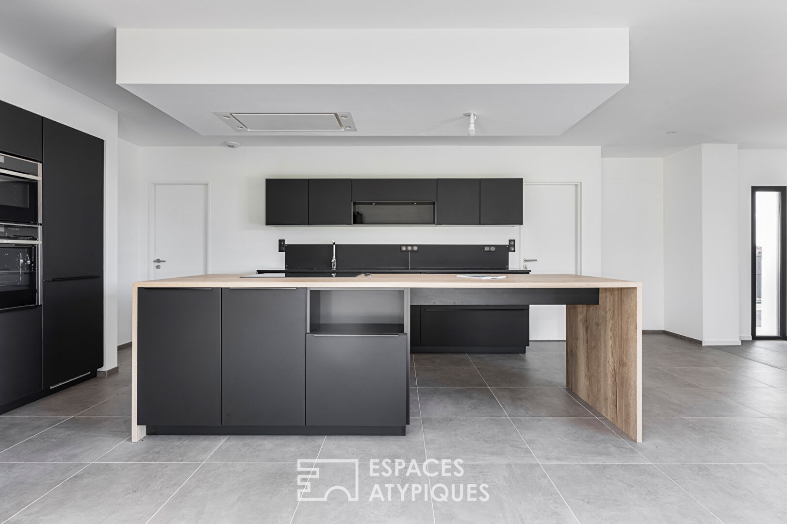 Le design épuré de la cuisine et son agencement fonctionnel en îlot central s’intègrent harmonieusement à l’espace de vie.