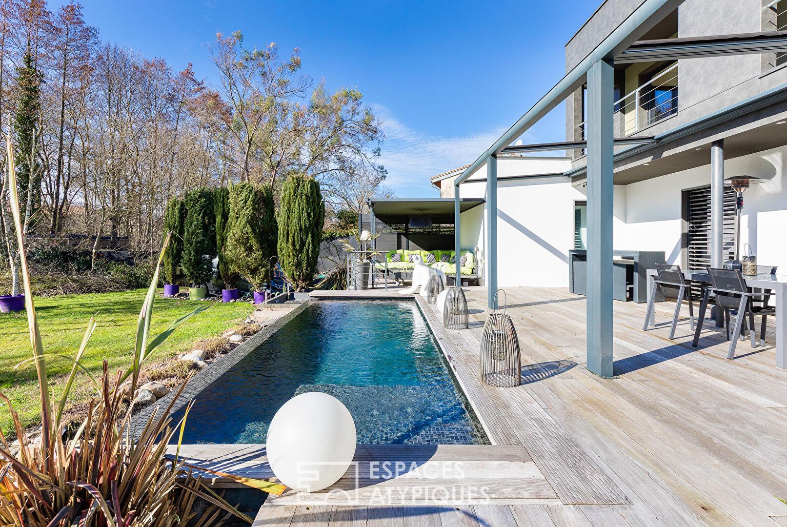 A l’extérieur, la parcelle de 2200 m2 dévoile différentes ambiances, potager, espace de jeux, coin détente au milieu des plantations, coin barbecue. Autour du bassin, les espaces invitent à ralentir et à profiter pleinement du cadre naturel.