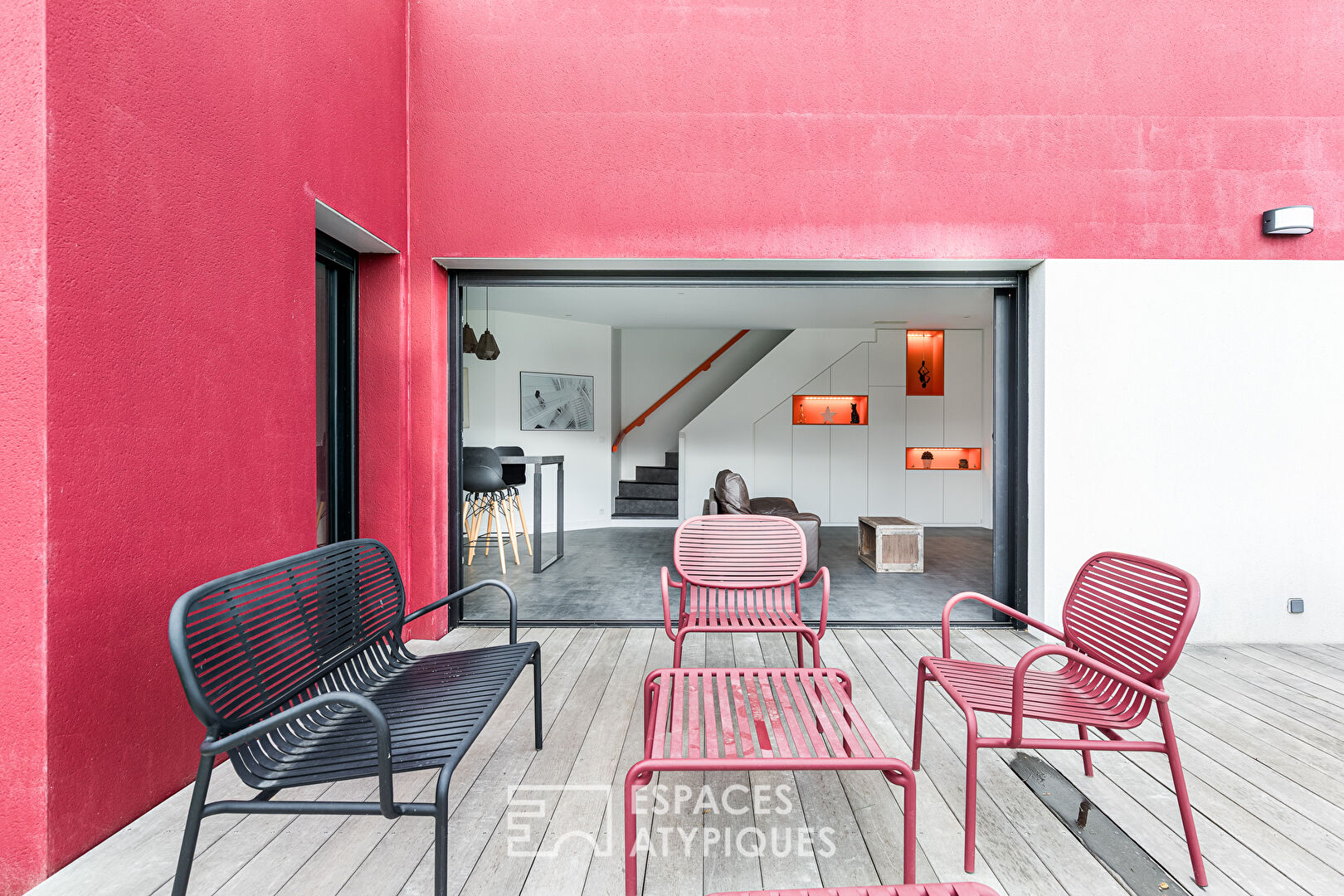 Le tout est ouvert sur la terrasse en bois prolongée par le jardin.