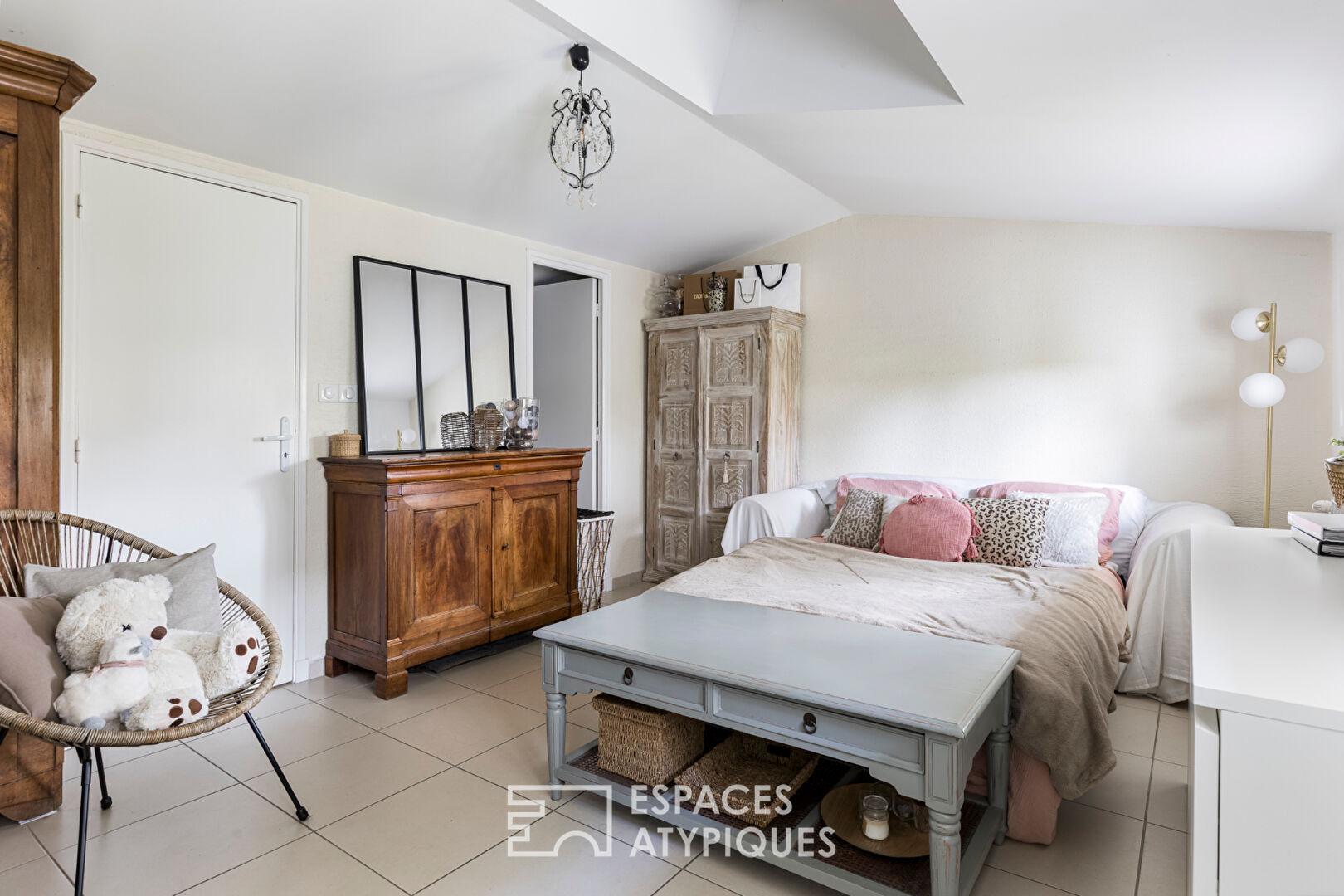 À l’extérieur, le jardin prolonge harmonieusement la maison. La piscine et la terrasse offrent un espace outdoor soigné, parfait pour profiter des longues saisons ensoleillées du Sud-Ouest.