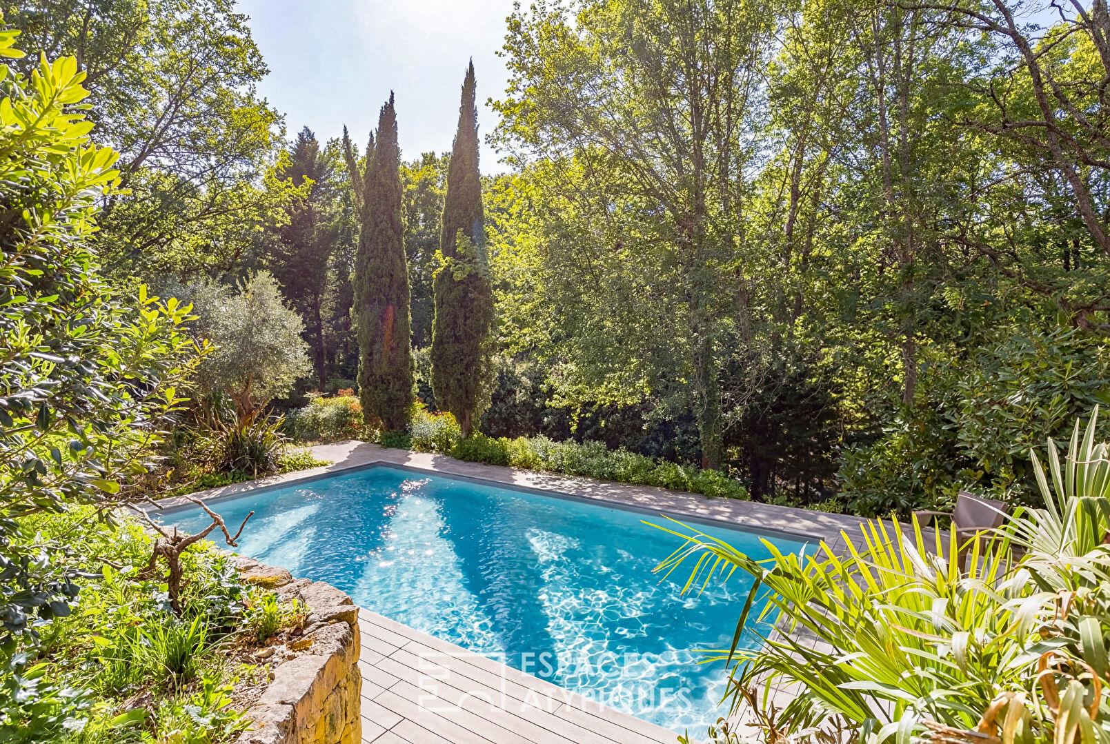 Tout autour, le parc boisé enveloppe la propriété dans un véritable écrin de verdure, créant une atmosphère intime et apaisante.