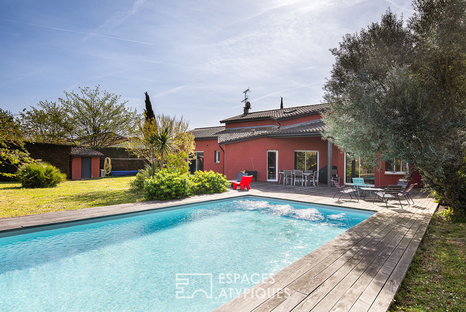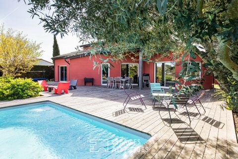 L’extérieur permet de profiter d’un agréable et paisible jardin paysagé. Il est agrémenté d’une grande terrasse avec piscine chauffée au sel.