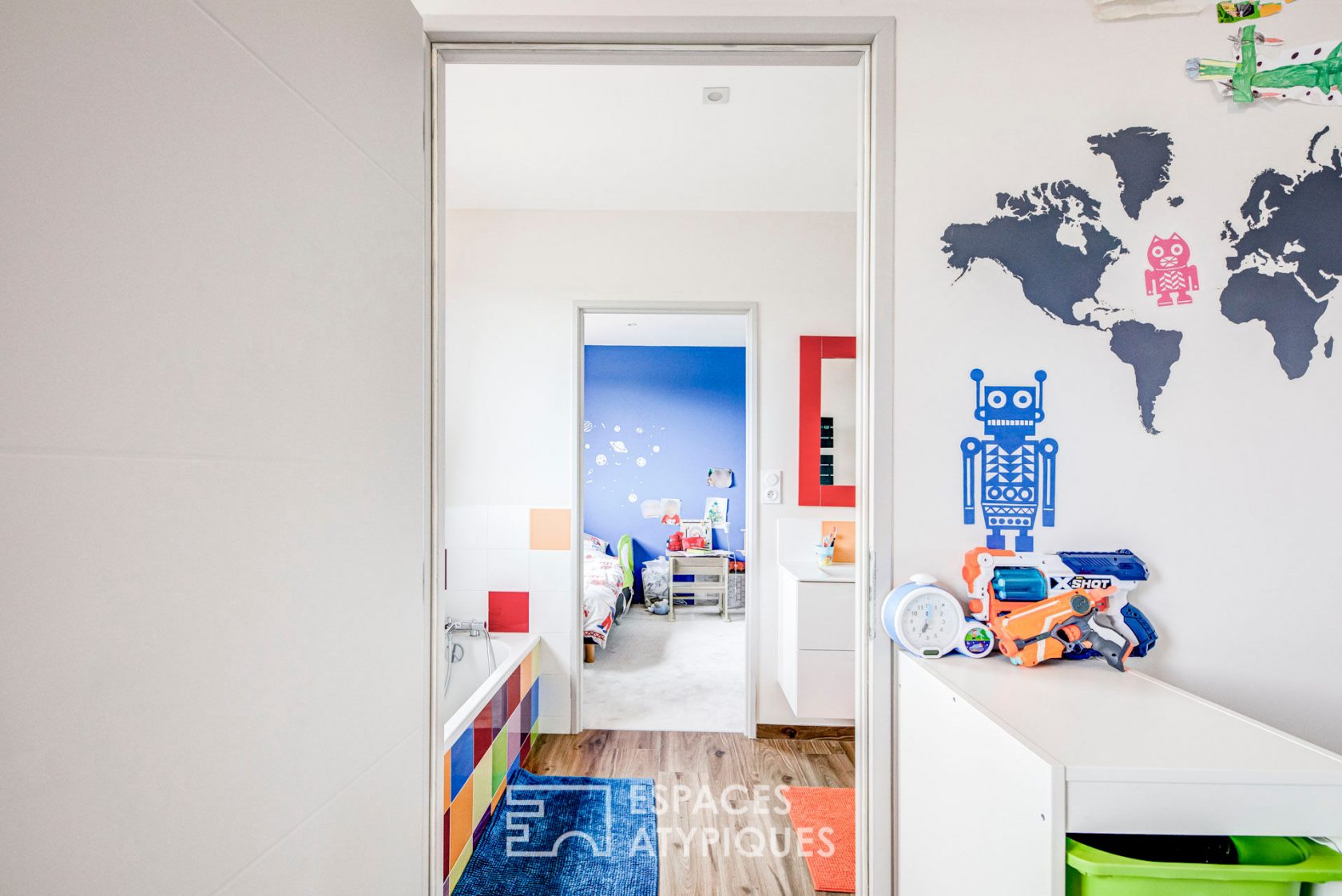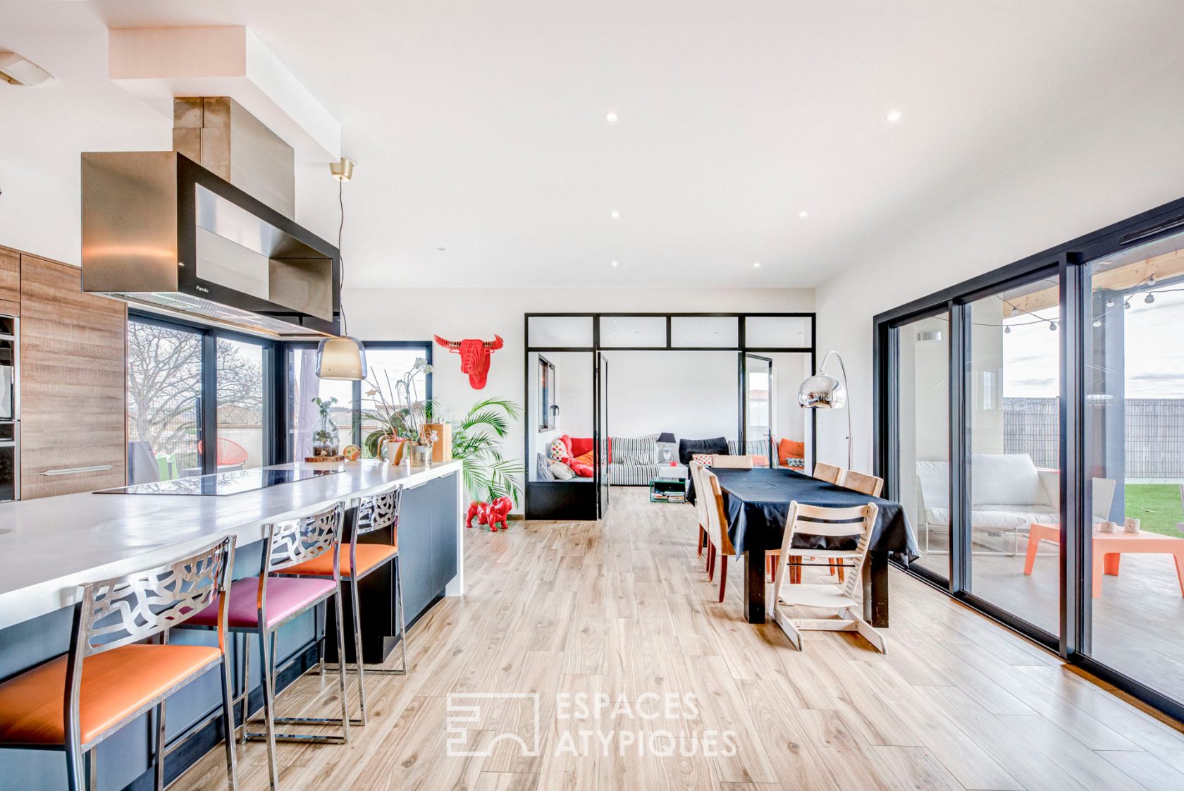 Cette maison d’architecte propose tous les avantages du confort d’une maison moderne, ancrée dans une région de terroir où il fait bon vivre, à l’Ouest de Toulouse.