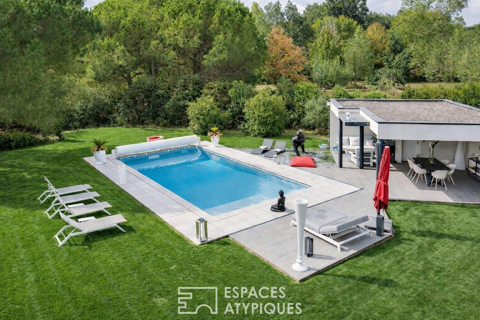 À l’extérieur, la terrasse s’étend autour d’une piscine chauffée, invitant à la détente au coeur d’un écrin de verdure. Le jardin, arboré et minutieusement entretenu, offre différentes ambiances selon les heures du jour : espace lounge, coin repas ombragé, zone de farniente. Un pool house complète cet ensemble, idéal pour recevoir en toute saison.